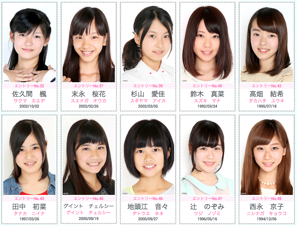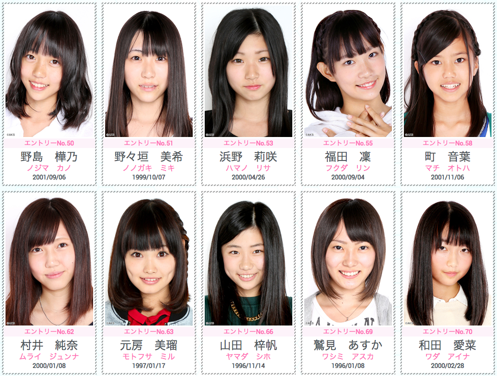 - 将来のエース候補なら18番が筆頭かね、ダンス習っててクラッシックバレーも出来るし。対抗で12番、50番ってとこ。ガチヲタっぽい21番はヲタ受けも良さそうだし本気度を感じる。あと特技ダンスの39番と趣味ダンスの53番も捨てがたいね。66番は年齢が気にけどつうちゃん路線なら有りなのかな?。49番はNMBに居そうな感じ、悪くないけど年齢考えると無しだし思い付きの軽い感じで受けにきてそう(地雷臭する)。49番が片言すぎて入ったら面白いけど飛び道具的には受けそう、あと何となく55番がSKEっぽいな~と感じた。以上、初めて動画を見た感想(けっこうまともな子が多いね)。
