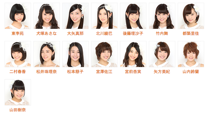 東李苑、犬塚あさな、大矢真那、北川綾巴、後藤理沙子、竹内舞、都築里佳、二村春香、松井珠里奈、松本慈子、宮澤佐江、宮前杏実、矢方美紀、山内鈴蘭、山田樹奈