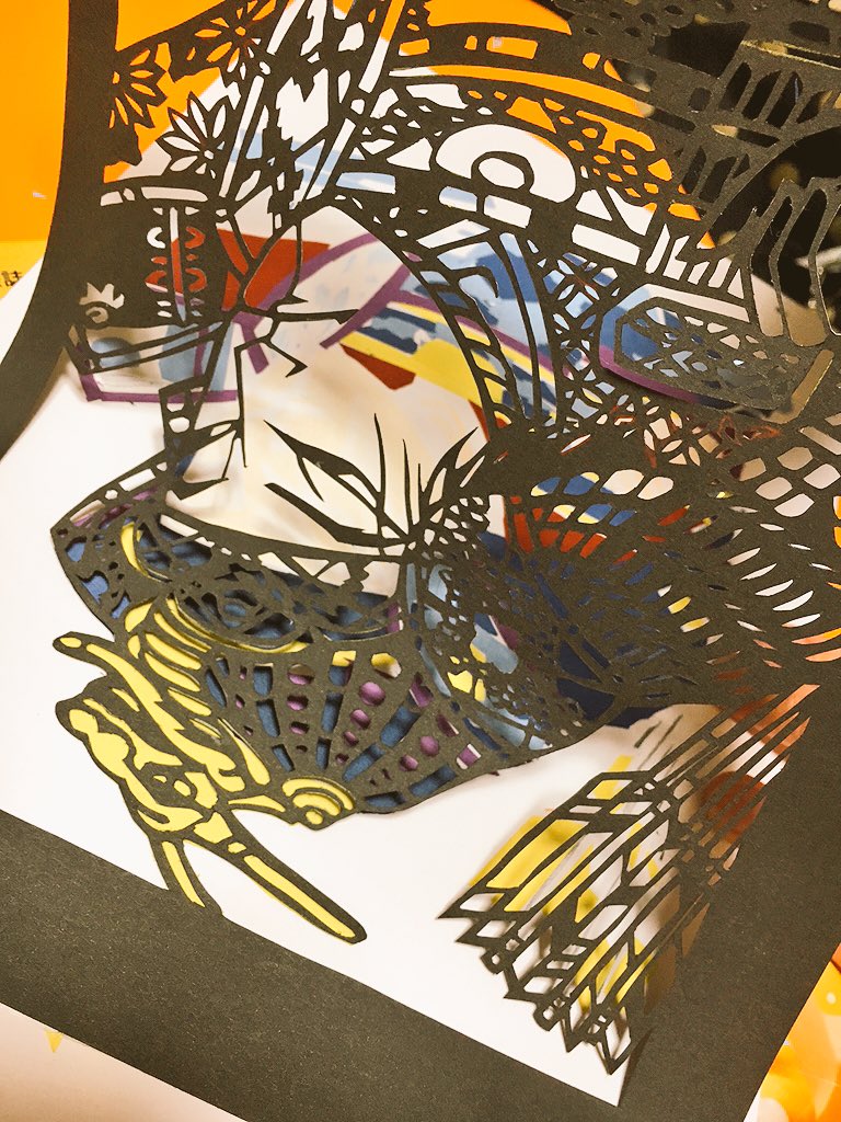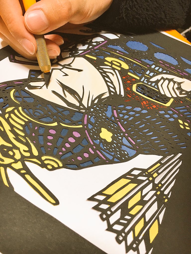 妹ちゃんが切り絵の作業中
