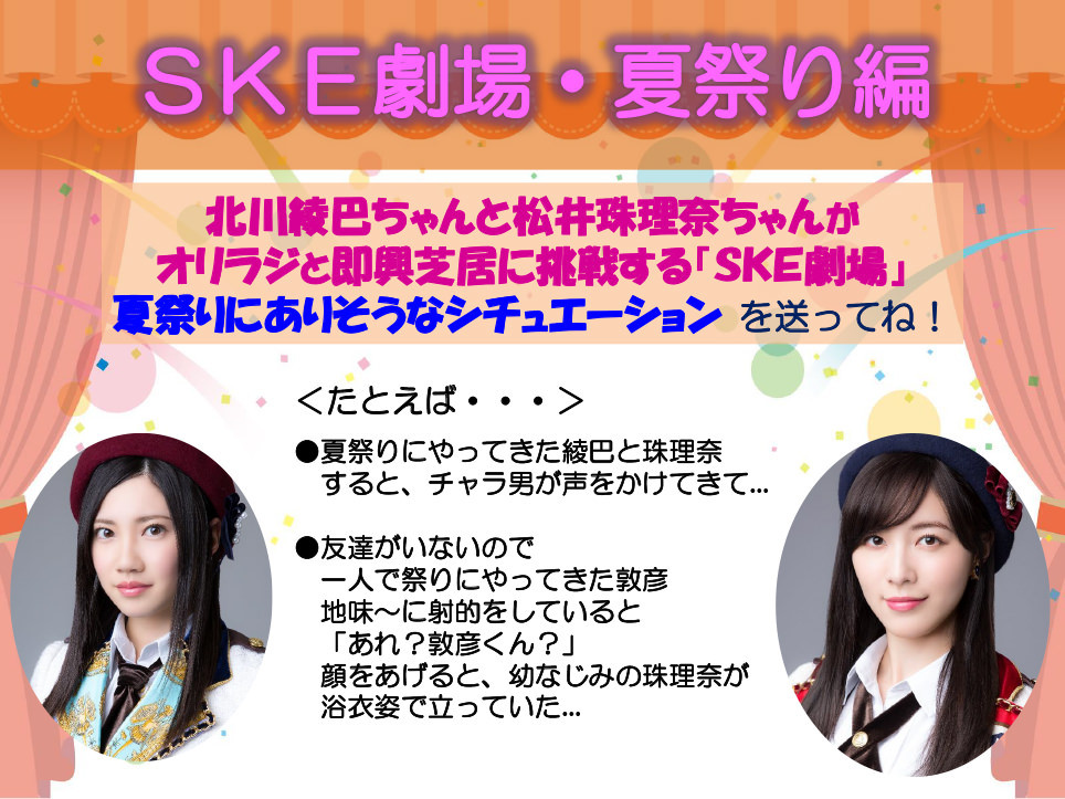 【サンデー】「SKE劇場・夏祭り編」オリラジ・北川綾巴さん、松井珠理奈さんが即興芝居に挑戦!コチラのテーマは夏祭りにありそうなシチュエーションを送ってください!https://t.co/RSqkWAUl7a #SKE48 #松井珠理奈 #北川綾巴 #nhkらじらー