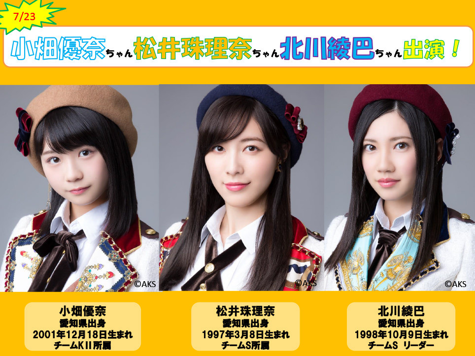 7月23日のらじらー!サンデーはSKE48・松井珠理奈さんが2時間通して登場!9時台に小畑優奈さん、10時台に北川綾巴さんも登場です。三人へ質問・メッセージ募集中!https://t.co/gWLrShpC9l #SKE48 #松井珠理奈 #小畑優奈 #北川綾巴 #nhkらじらー