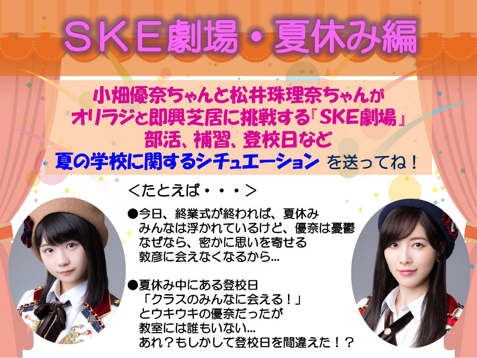 【サンデー】「SKE劇場・夏休み編」小畑優奈さん・松井珠理奈さんとオリラジが即興芝居に挑戦!今回は部活や夏期講習、補習など”夏の学校”に関するシチュエーションを募集中!https://t.co/RSqkWAUl7a #SKE48 #松井珠理奈 #小畑優奈 #nhkらじらー