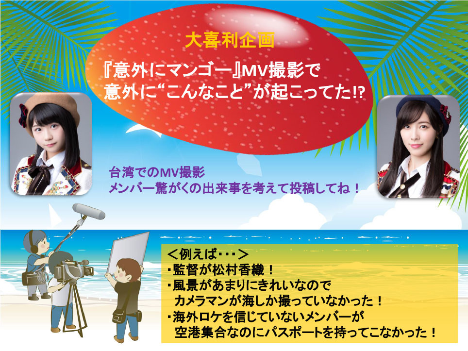 【サンデー】「『意外にマンゴー』MV撮影で意外にこんなことが起こってた!?」MV撮影でメンバーが驚愕した出来事を投稿してください!例:MVの監督が松村香織…みたいなメール募集中https://t.co/zWUYIOYUz6 #SKE48 #松井珠理奈 #小畑優奈 #nhkらじらー