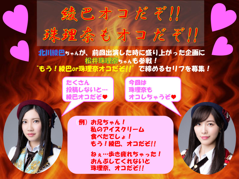 【サンデー】「綾巴オコだぞ!!珠理奈もオコだぞ!!」北川綾巴さんが前回出演時に盛り上がった企画に松井珠理奈さんも挑戦!綾巴or珠理奈、オコだぞ!で終わるセリフを送ってください!https://t.co/FdHEs8DgFx #SKE48 #松井珠理奈 #北川綾巴 #nhkらじらー