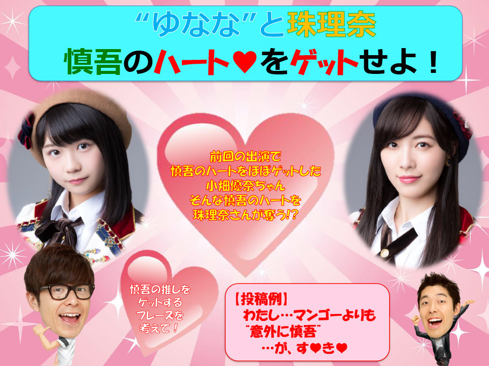 【サンデー】「ゆななと珠理奈 慎吾のハートをゲットせよ!」前回の出演で藤森さんのハートをほぼゲットした小畑優奈さん!そんな藤森さんのハートを珠理奈さんが奪う!?https://t.co/rC4PaUCjom #SKE48 #松井珠理奈 #小畑優奈 #nhkらじらー