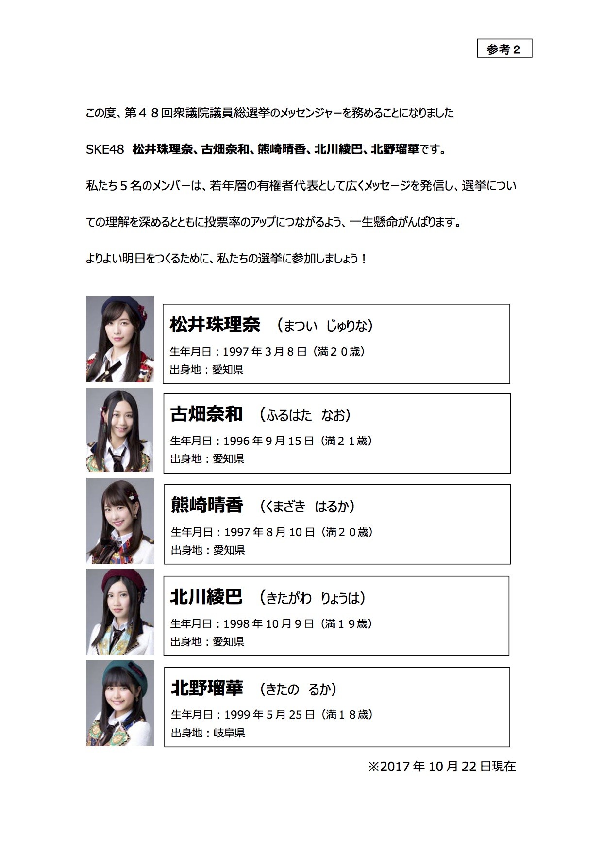 SKE48松井珠理奈、木本花音、二村春香、古畑奈和、熊崎晴香が愛知県参議院議員選挙『18歳選挙権』選挙啓発メッセンジャーに起用される!