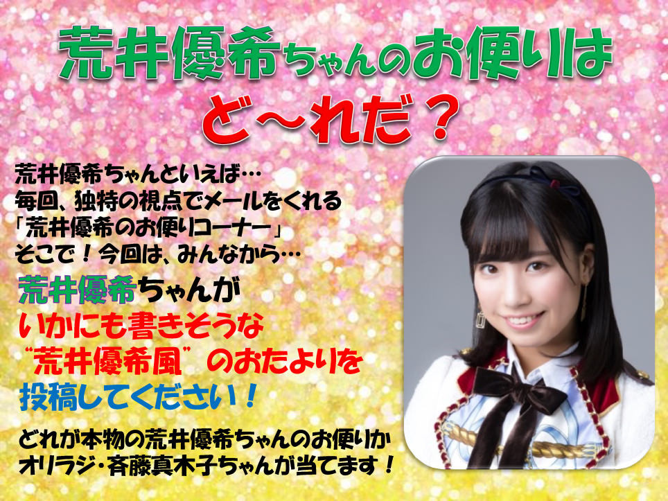 荒井さんがいかにも書きそうな"荒井優希風"のお便りを大募集!どれが本物かオリラジと斉藤さんが当てます!https://t.co/FdHEs8DgFx #SKE48 #荒井優希 #斉藤真木子 #nhkらじらー