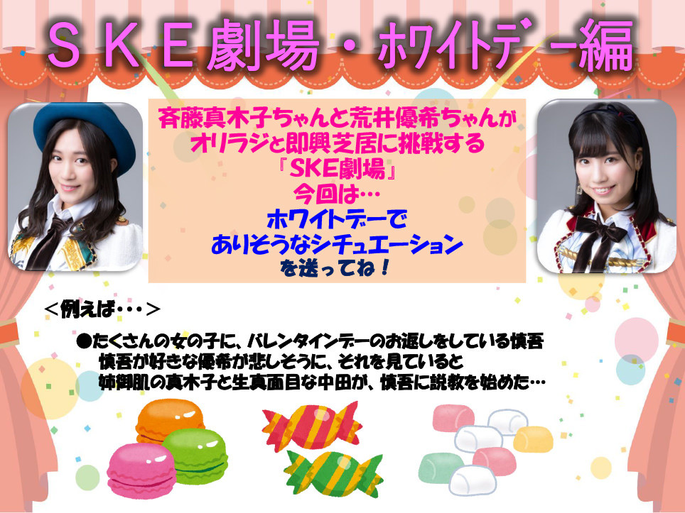 【サンデー】『SKE劇場・ホワイトデー編』斉藤さんと荒井さんがオリラジと即興芝居に挑戦するSKE劇場。今回はホワイトデーでありそうなシチュエーションを大募集!https://t.co/RSqkWAUl7a #SKE48 #斉藤真木子 #荒井優希 #nhkらじらー