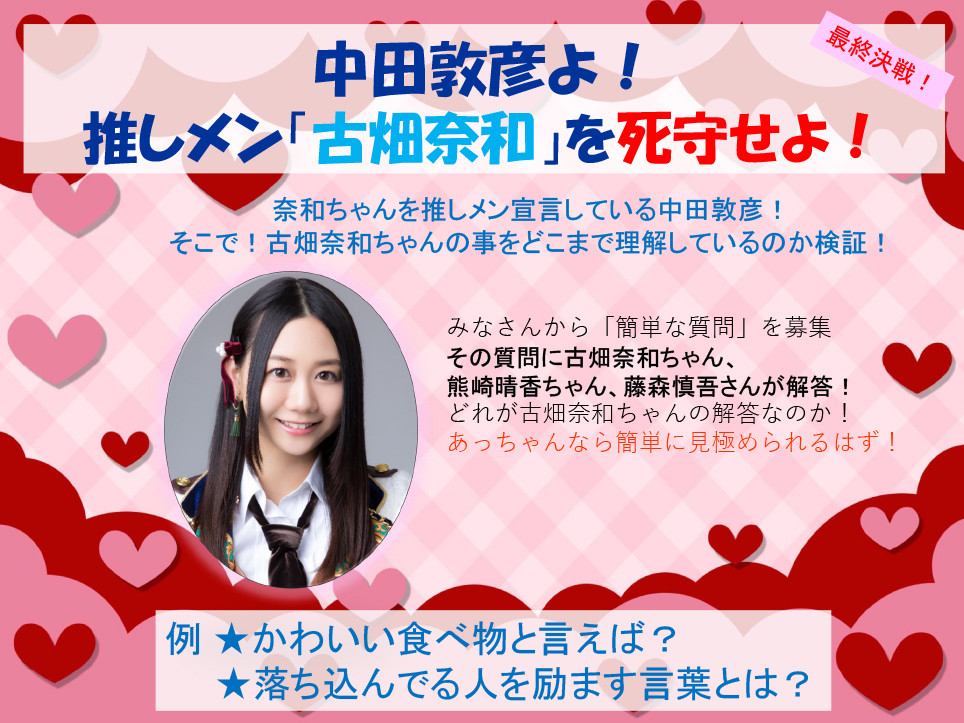 古畑さんを推しメン宣言している中田敦彦。そこで、古畑さんの事をどこまで理解しているのか検証します!"簡単な質問"を大募集!https://t.co/MhcngwK7D2 #SKE48 #古畑奈和 #nhkらじらー