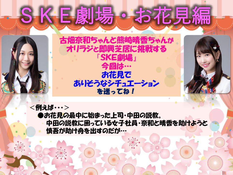 古畑さんと熊崎さんがオリラジと即興芝居に挑戦するSKE劇場。今回はお花見でありそうなシチュエーションを大募集!https://t.co/RSqkWAUl7a #SKE48 #古畑奈和 #熊崎晴香 #nhkらじらー
