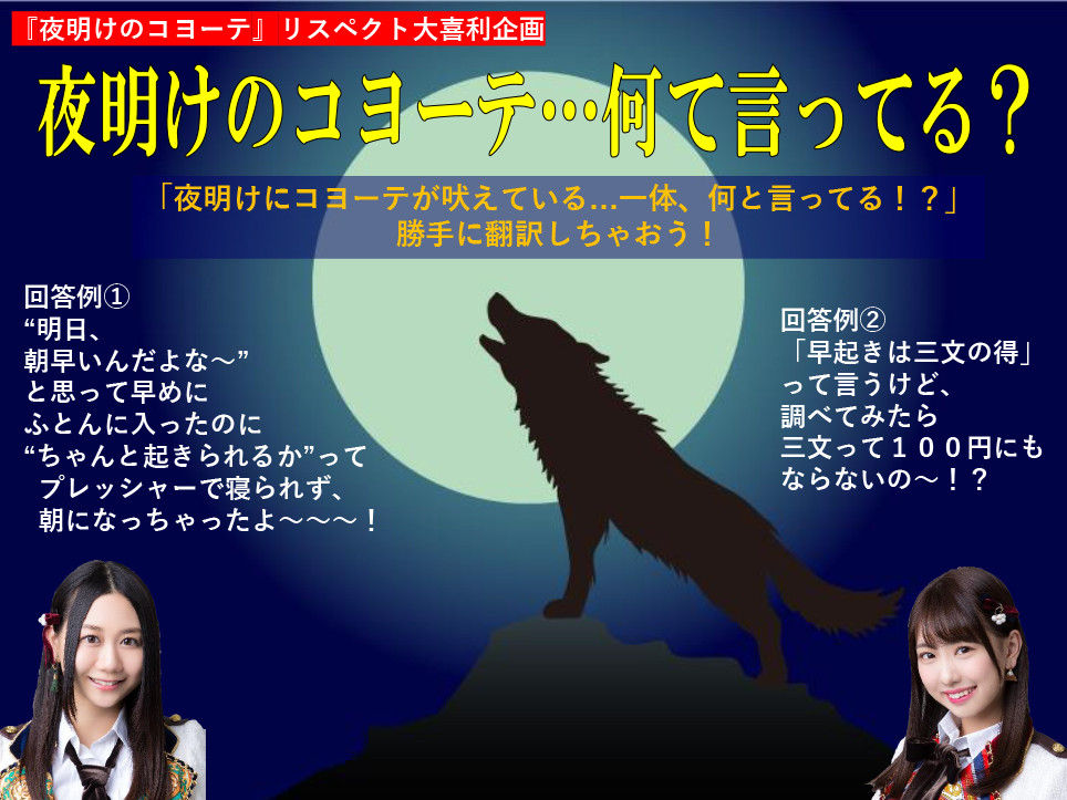 「夜明けにコヨーテが吠えている…一体、何と言っている!?」勝手に翻訳しちゃおう!https://t.co/zWUYIOYUz6 #SKE48 #古畑奈和 #熊崎晴香 #nhkらじらー