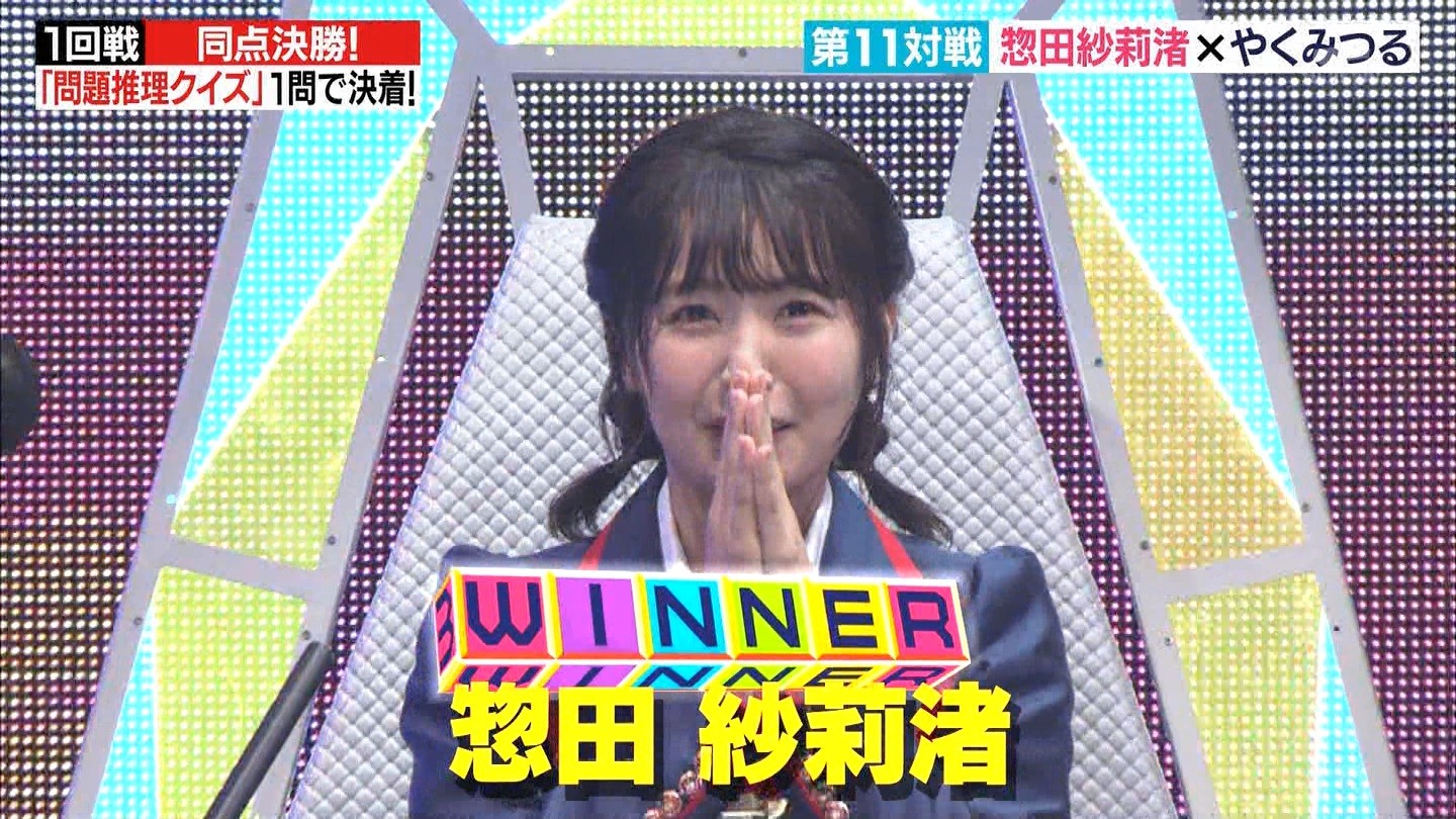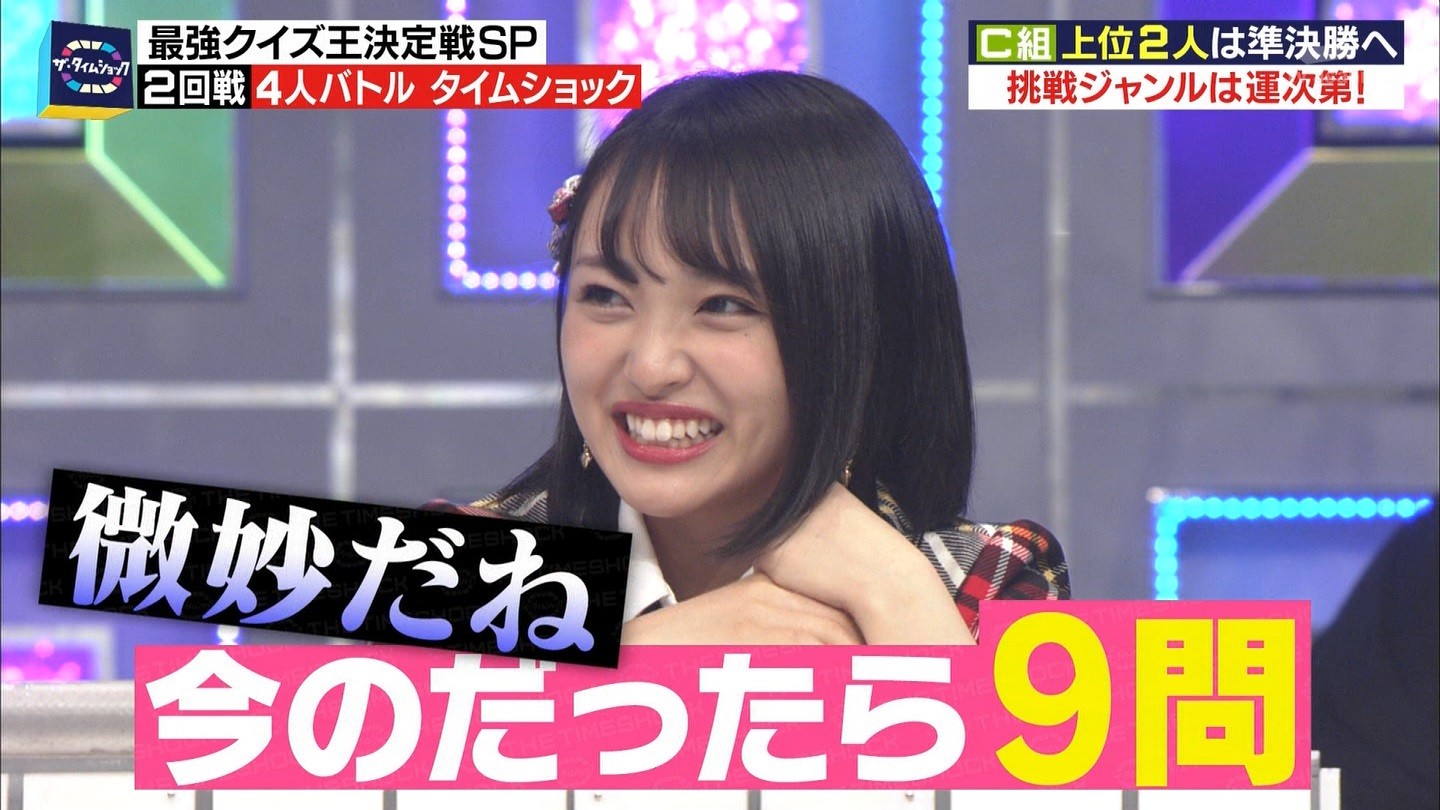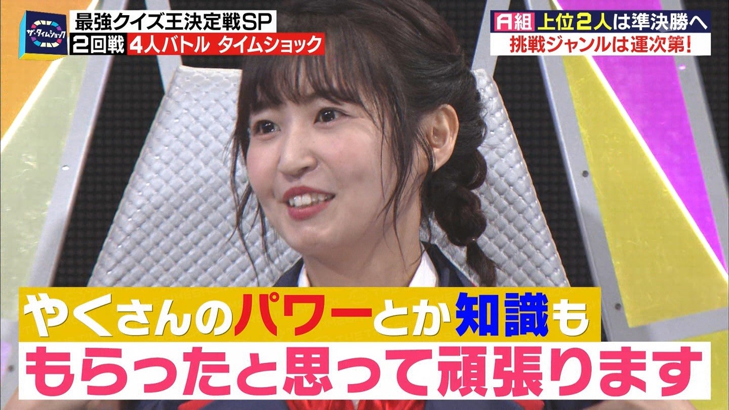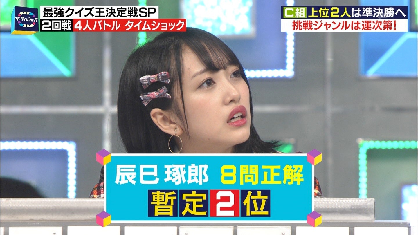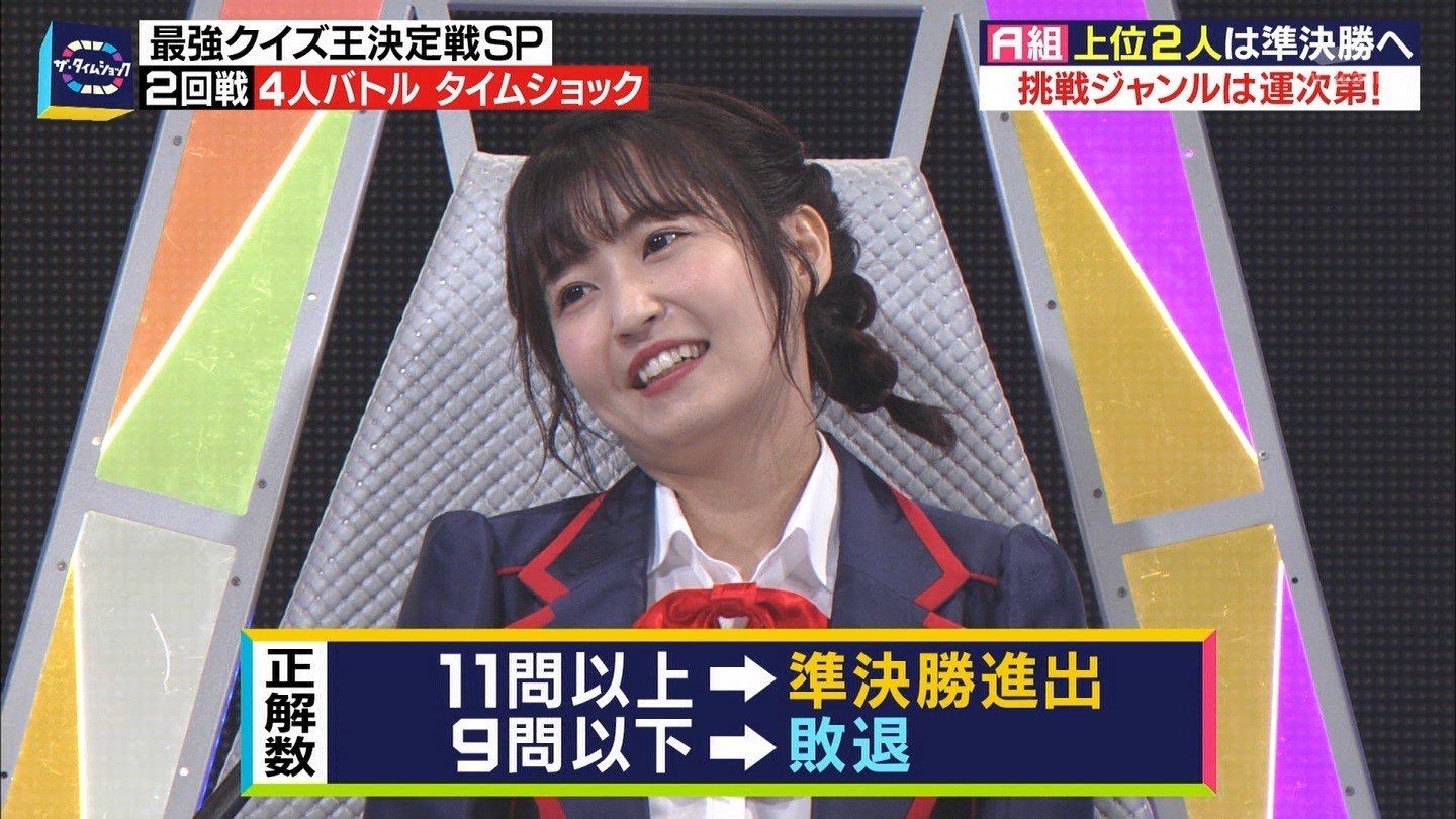 - ※14 勝っただけでなく、勝ち方が良かった。最後の問題で追いついて、推理問題でやくさんとほぼ同時に答えての、タッチの差での勝利。オーディション合格の時から変わらない、ギリギリセーフのチキンレースが持ち味。この子は持ってるわ。これからもクイズレジェンド達をバッタバッタとやっつけてって欲しい。ただ、一つ注文をつけるとすれば、「なんとしても勝たなきゃ!」の気持ちは分かるけど、そこは抑えて、その場の雰囲気も楽しめるくらいに、遊び心が持てるようになれれば満点です♪
