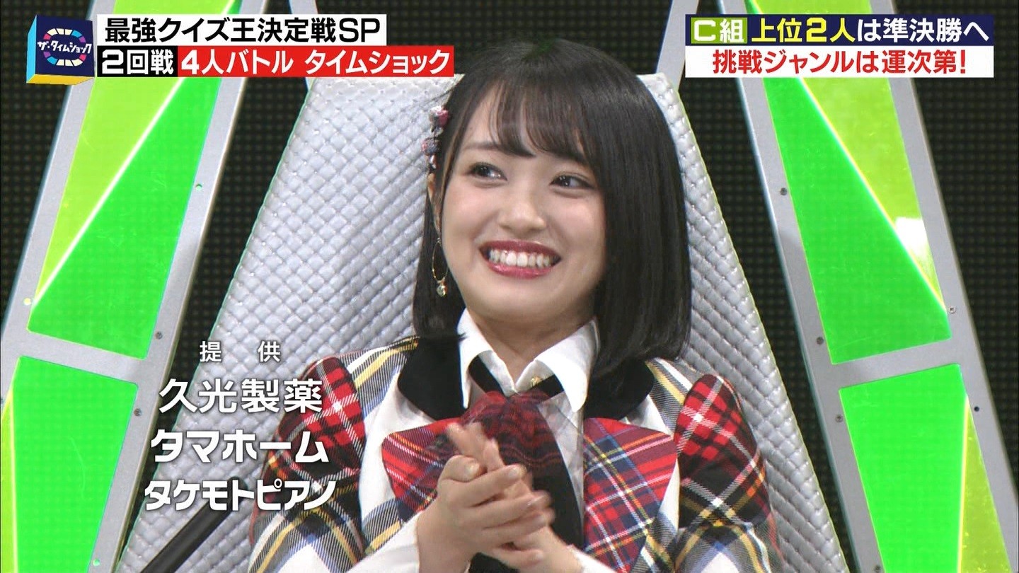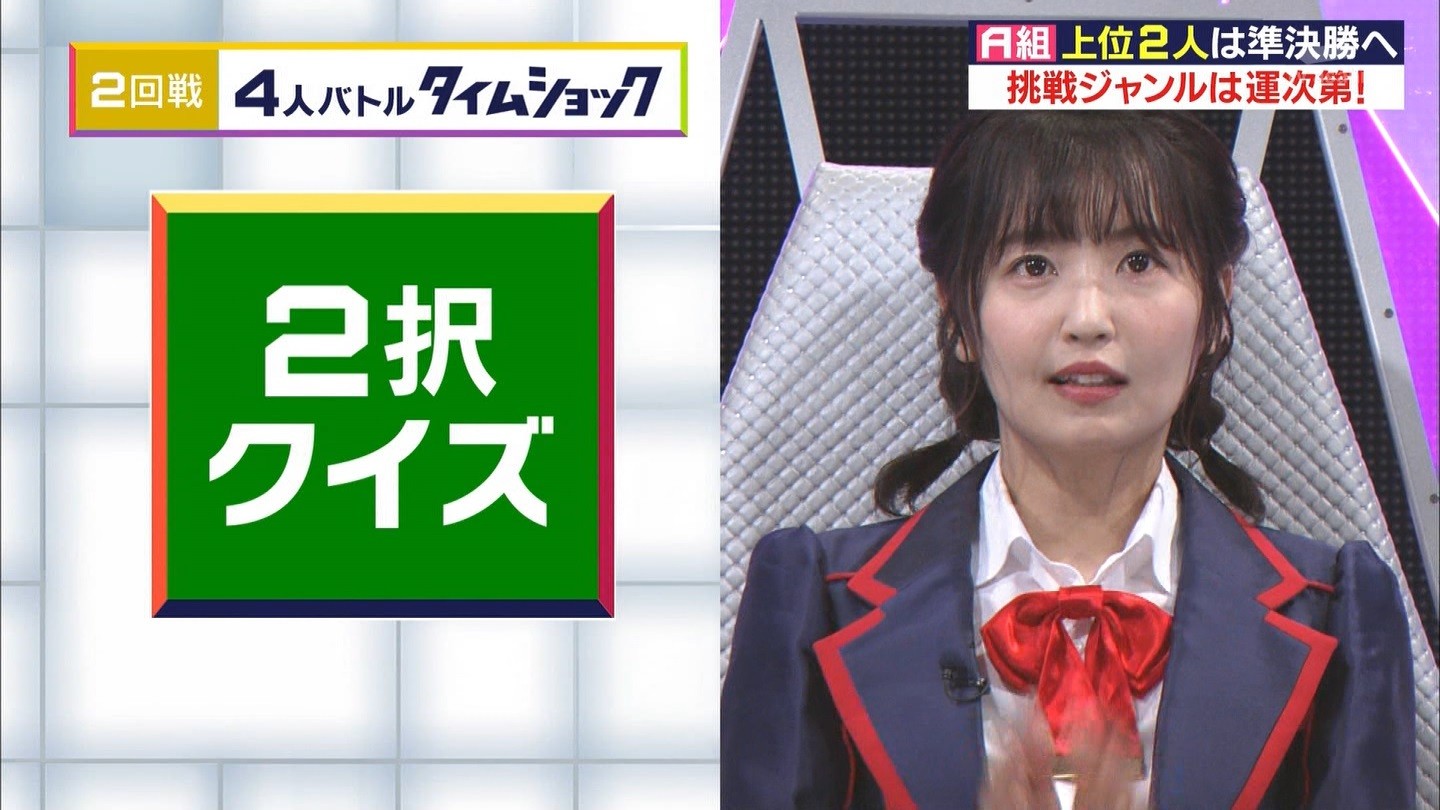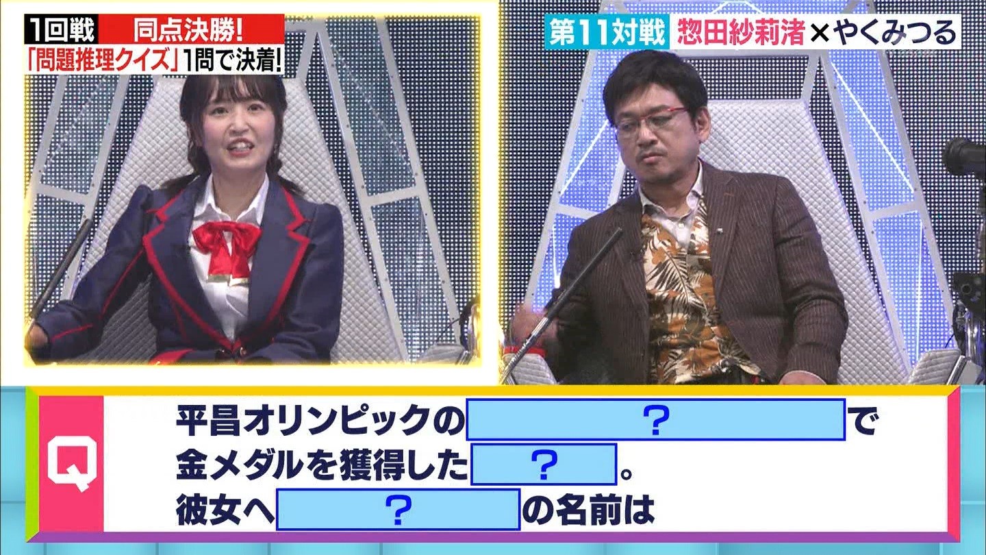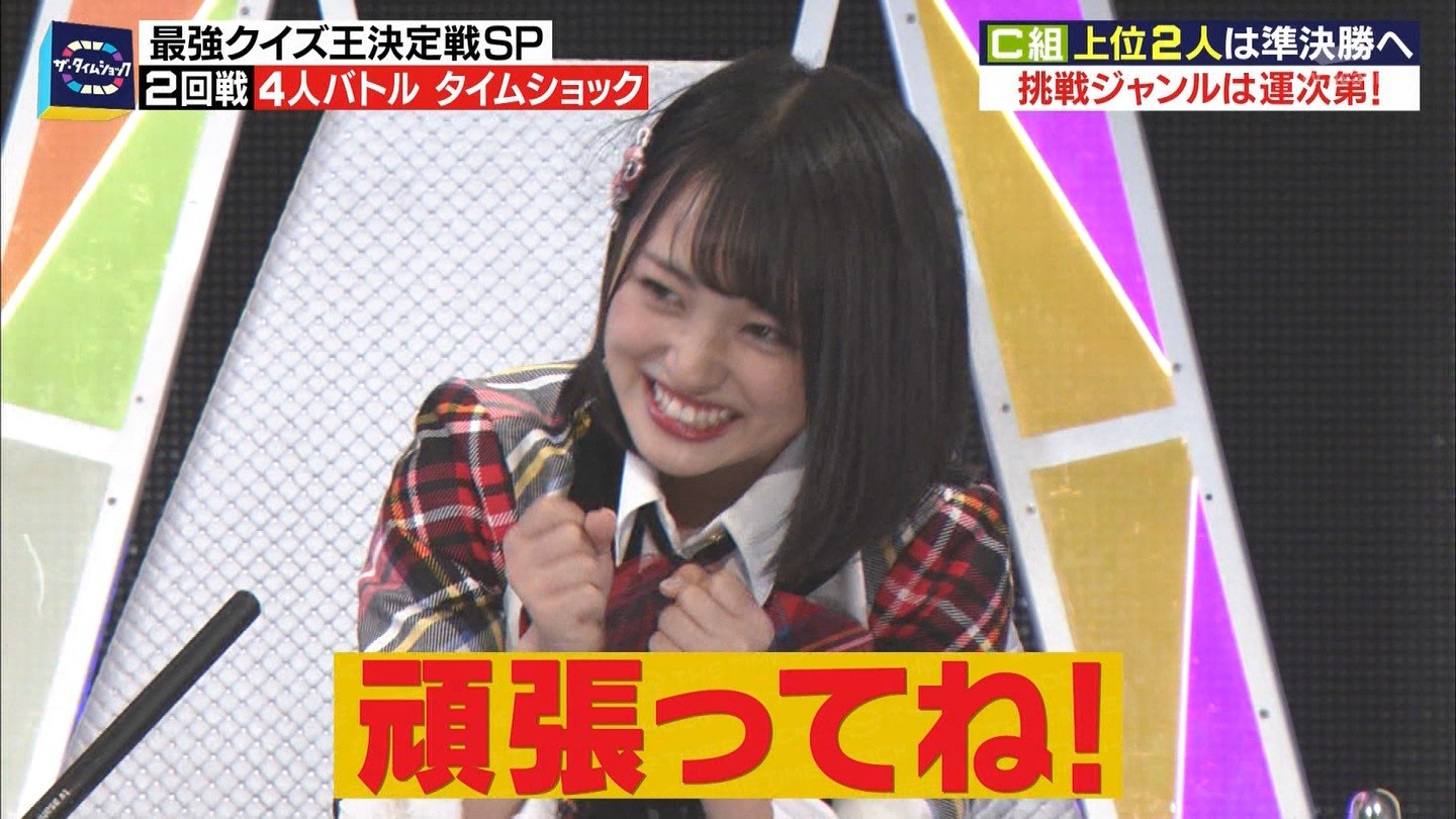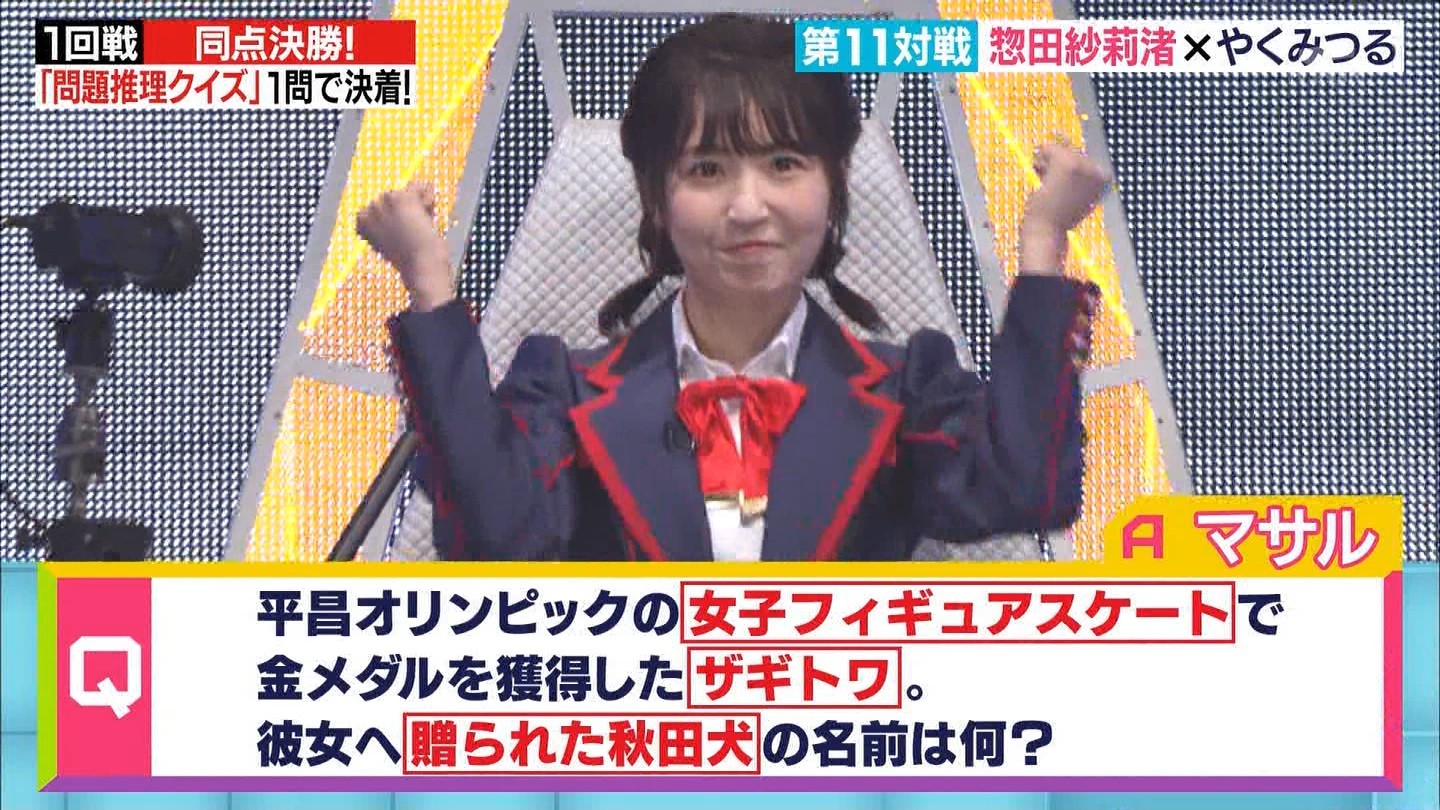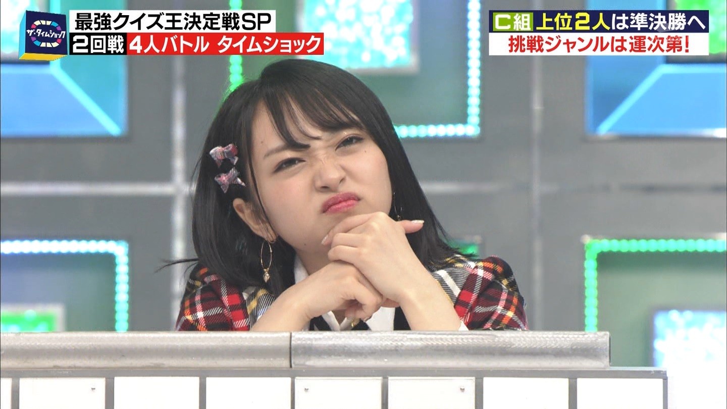 - ※14 勝っただけでなく、勝ち方が良かった。最後の問題で追いついて、推理問題でやくさんとほぼ同時に答えての、タッチの差での勝利。オーディション合格の時から変わらない、ギリギリセーフのチキンレースが持ち味。この子は持ってるわ。これからもクイズレジェンド達をバッタバッタとやっつけてって欲しい。ただ、一つ注文をつけるとすれば、「なんとしても勝たなきゃ!」の気持ちは分かるけど、そこは抑えて、その場の雰囲気も楽しめるくらいに、遊び心が持てるようになれれば満点です♪