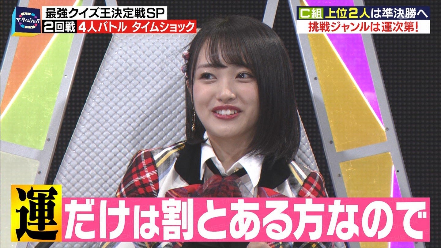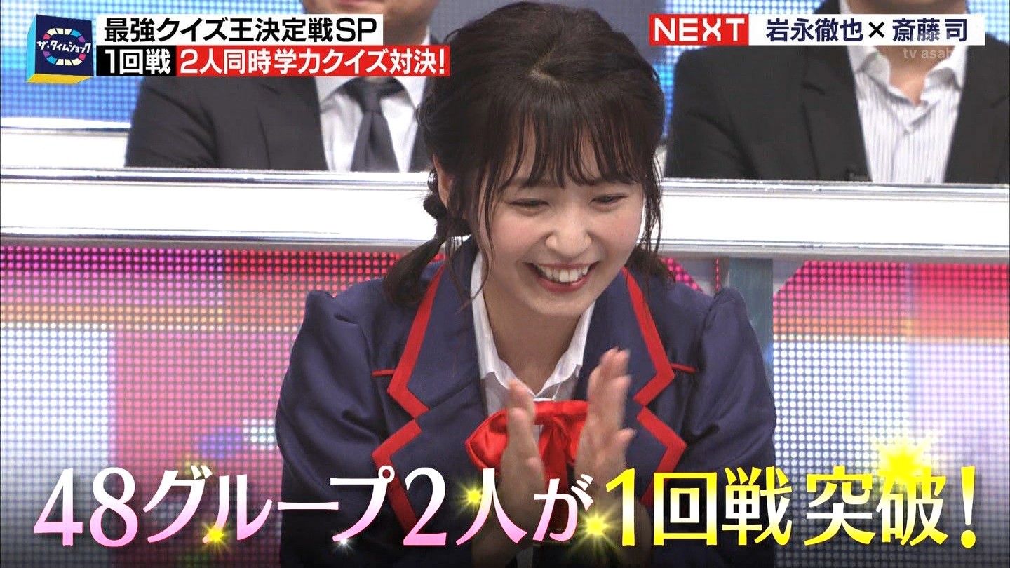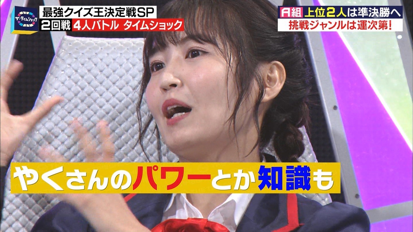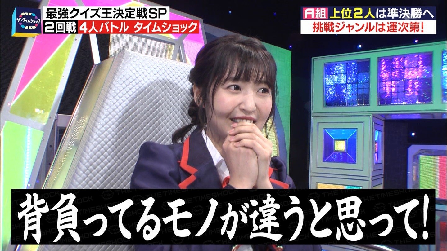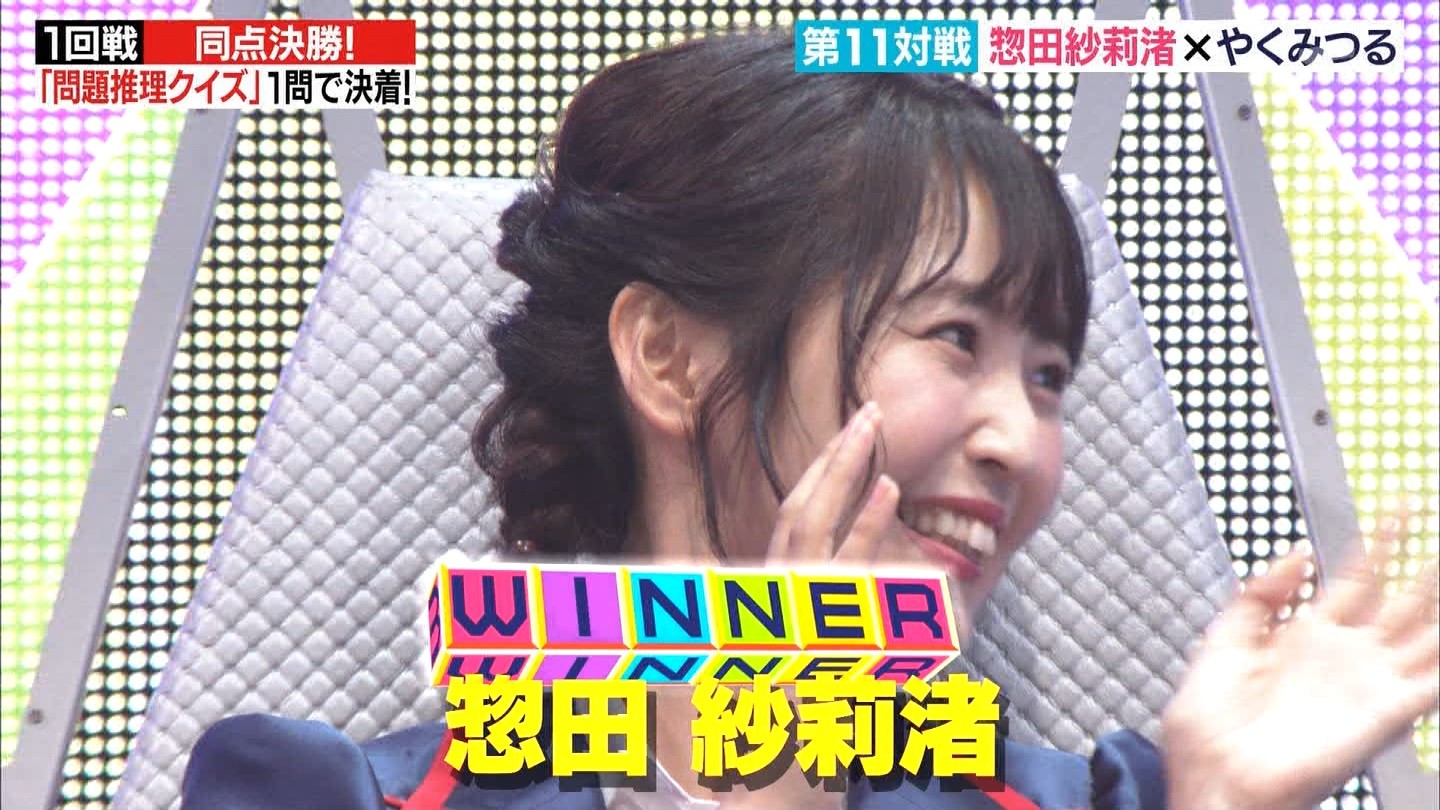 - ※14 勝っただけでなく、勝ち方が良かった。最後の問題で追いついて、推理問題でやくさんとほぼ同時に答えての、タッチの差での勝利。オーディション合格の時から変わらない、ギリギリセーフのチキンレースが持ち味。この子は持ってるわ。これからもクイズレジェンド達をバッタバッタとやっつけてって欲しい。ただ、一つ注文をつけるとすれば、「なんとしても勝たなきゃ!」の気持ちは分かるけど、そこは抑えて、その場の雰囲気も楽しめるくらいに、遊び心が持てるようになれれば満点です♪