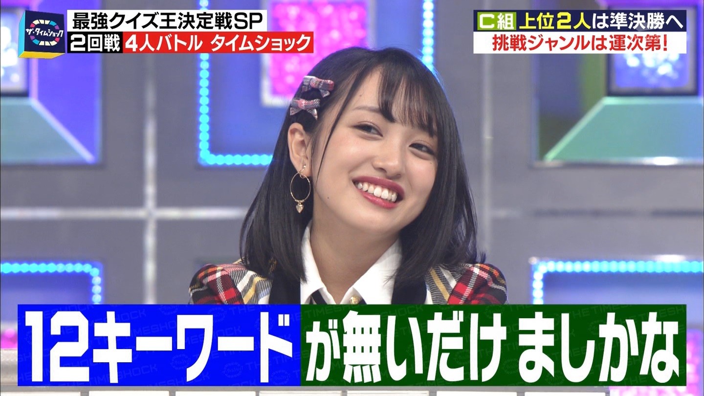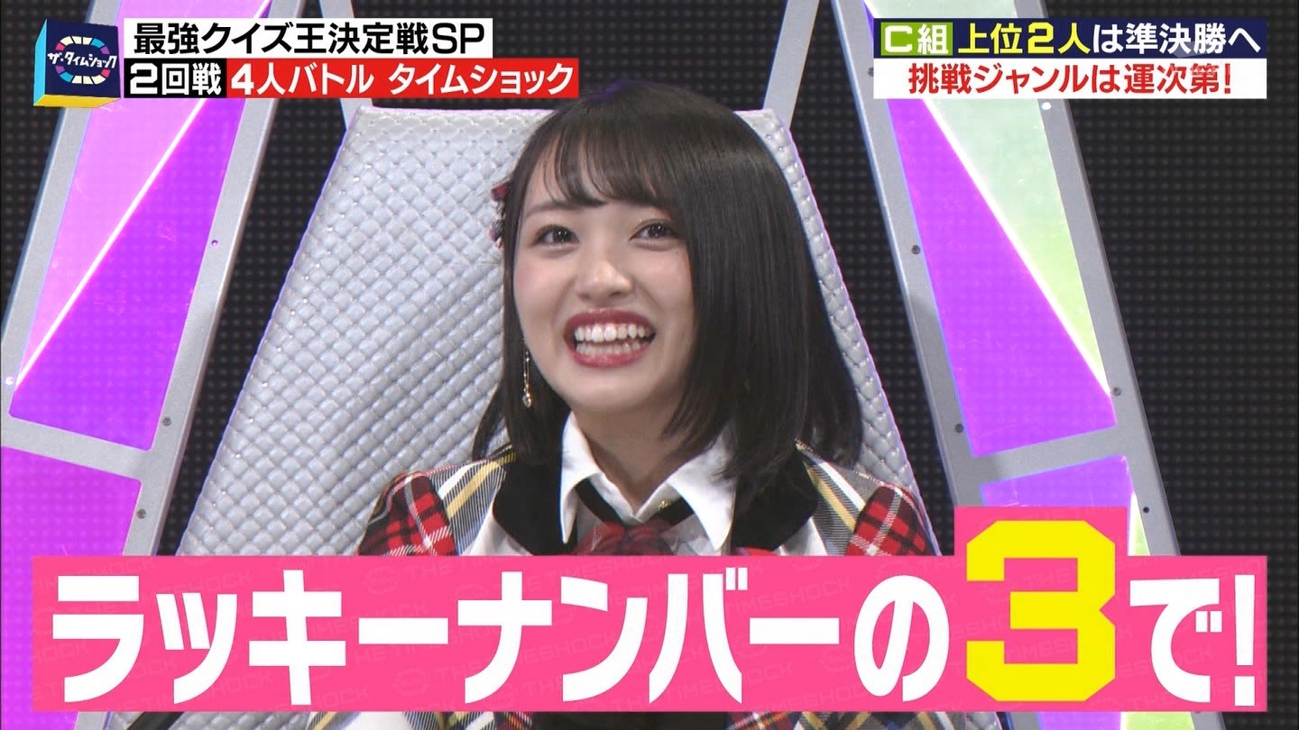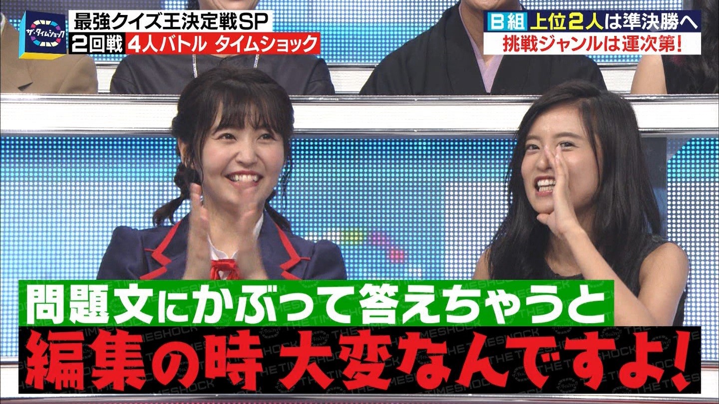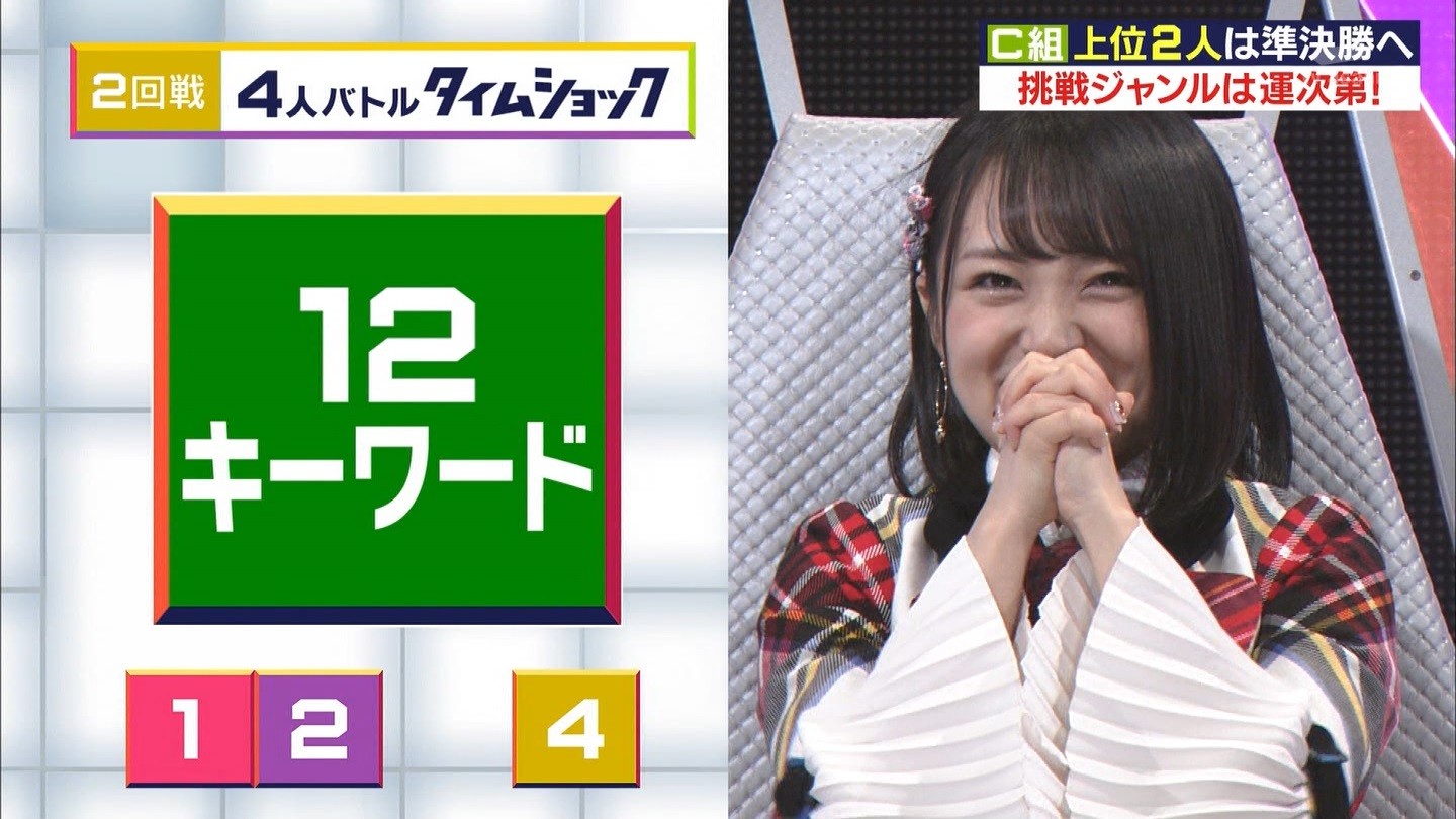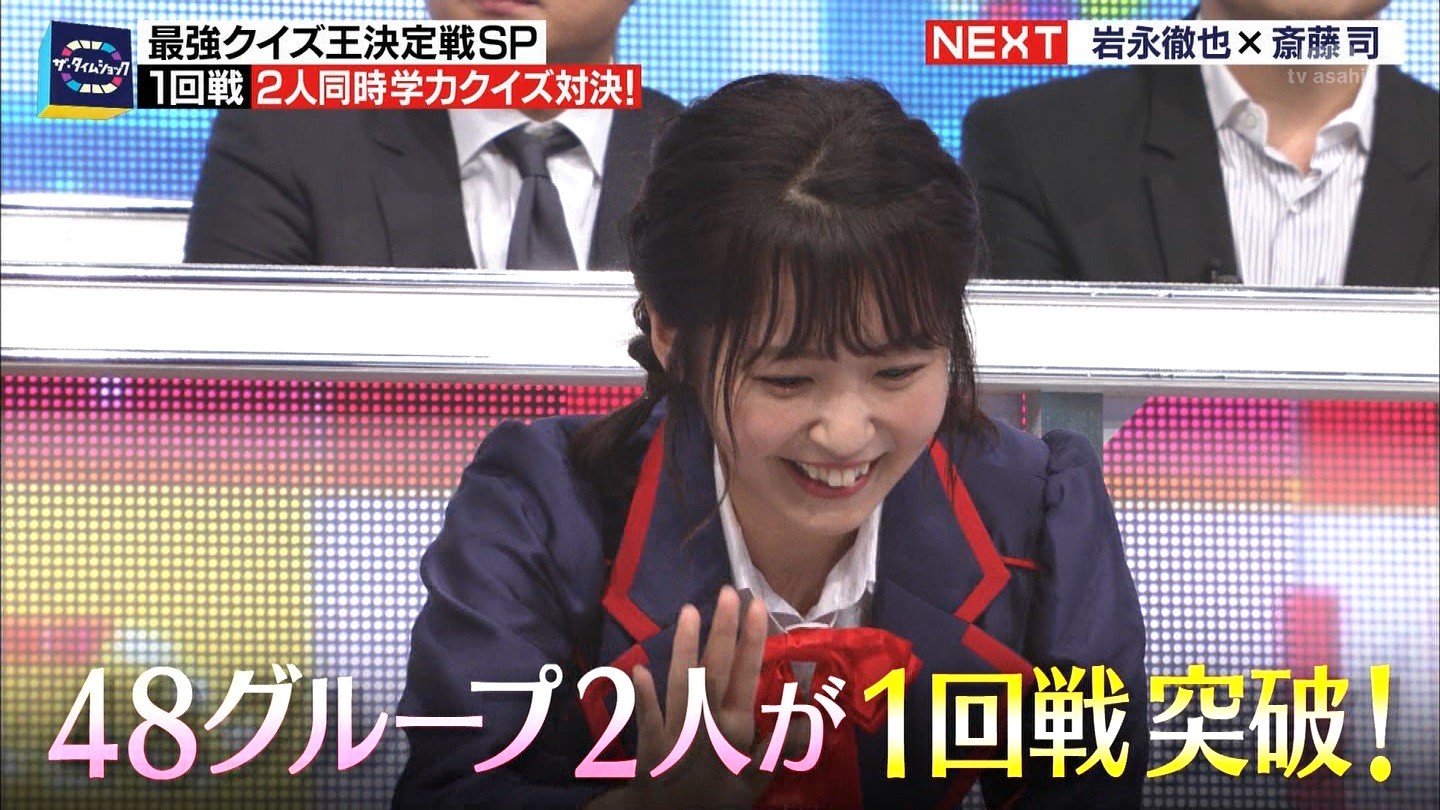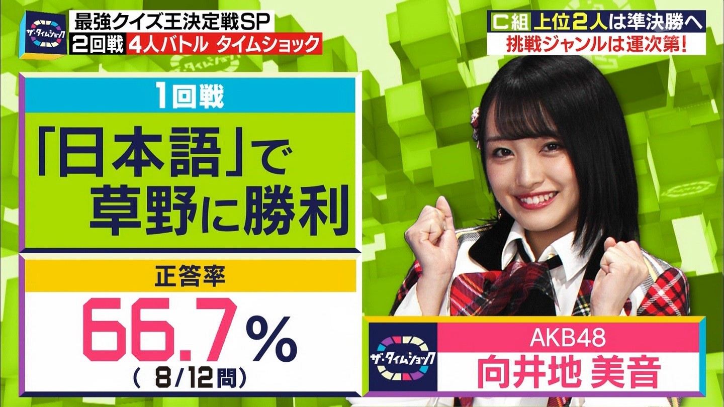 - ※14 勝っただけでなく、勝ち方が良かった。最後の問題で追いついて、推理問題でやくさんとほぼ同時に答えての、タッチの差での勝利。オーディション合格の時から変わらない、ギリギリセーフのチキンレースが持ち味。この子は持ってるわ。これからもクイズレジェンド達をバッタバッタとやっつけてって欲しい。ただ、一つ注文をつけるとすれば、「なんとしても勝たなきゃ!」の気持ちは分かるけど、そこは抑えて、その場の雰囲気も楽しめるくらいに、遊び心が持てるようになれれば満点です♪