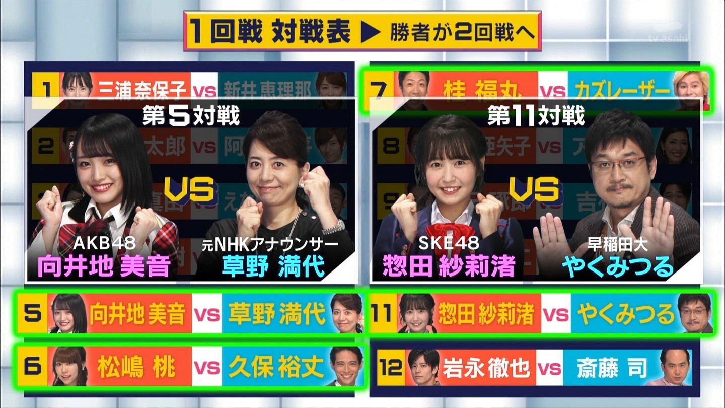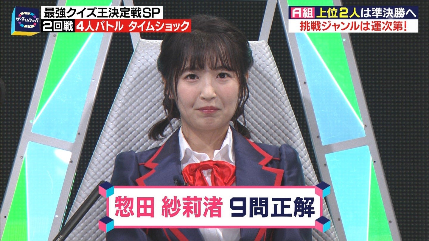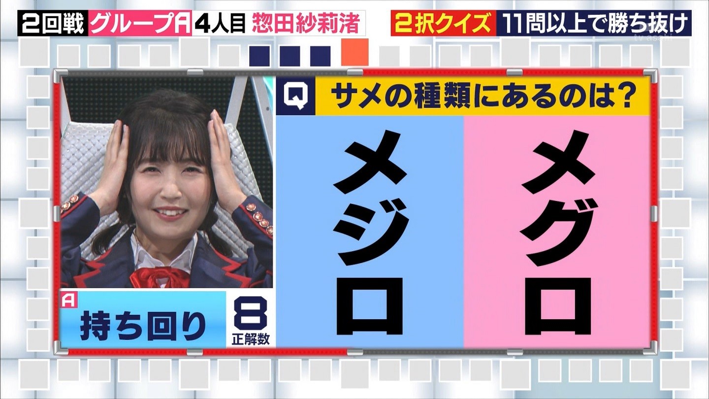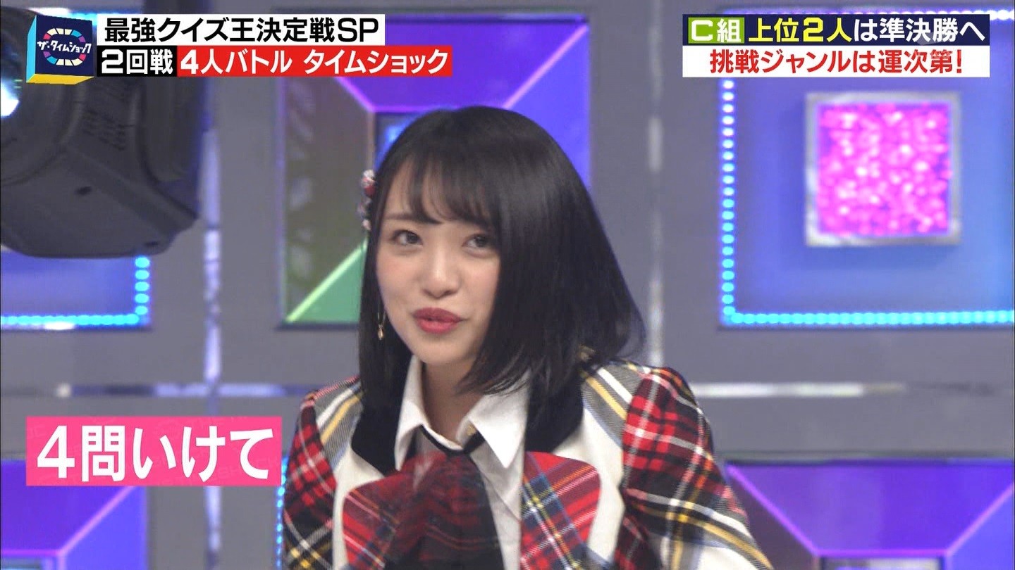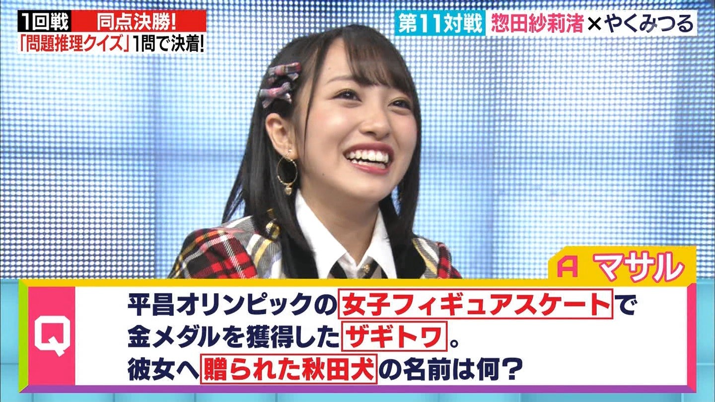 - ※14 勝っただけでなく、勝ち方が良かった。最後の問題で追いついて、推理問題でやくさんとほぼ同時に答えての、タッチの差での勝利。オーディション合格の時から変わらない、ギリギリセーフのチキンレースが持ち味。この子は持ってるわ。これからもクイズレジェンド達をバッタバッタとやっつけてって欲しい。ただ、一つ注文をつけるとすれば、「なんとしても勝たなきゃ!」の気持ちは分かるけど、そこは抑えて、その場の雰囲気も楽しめるくらいに、遊び心が持てるようになれれば満点です♪
