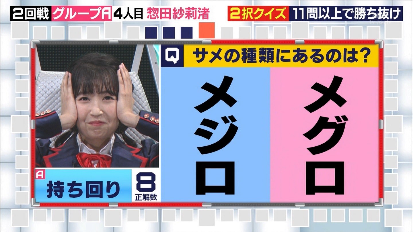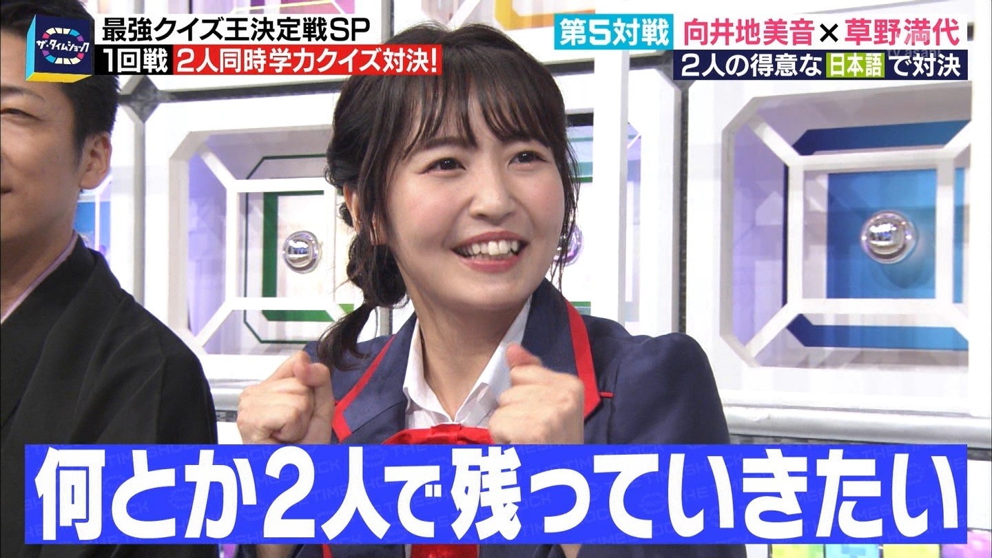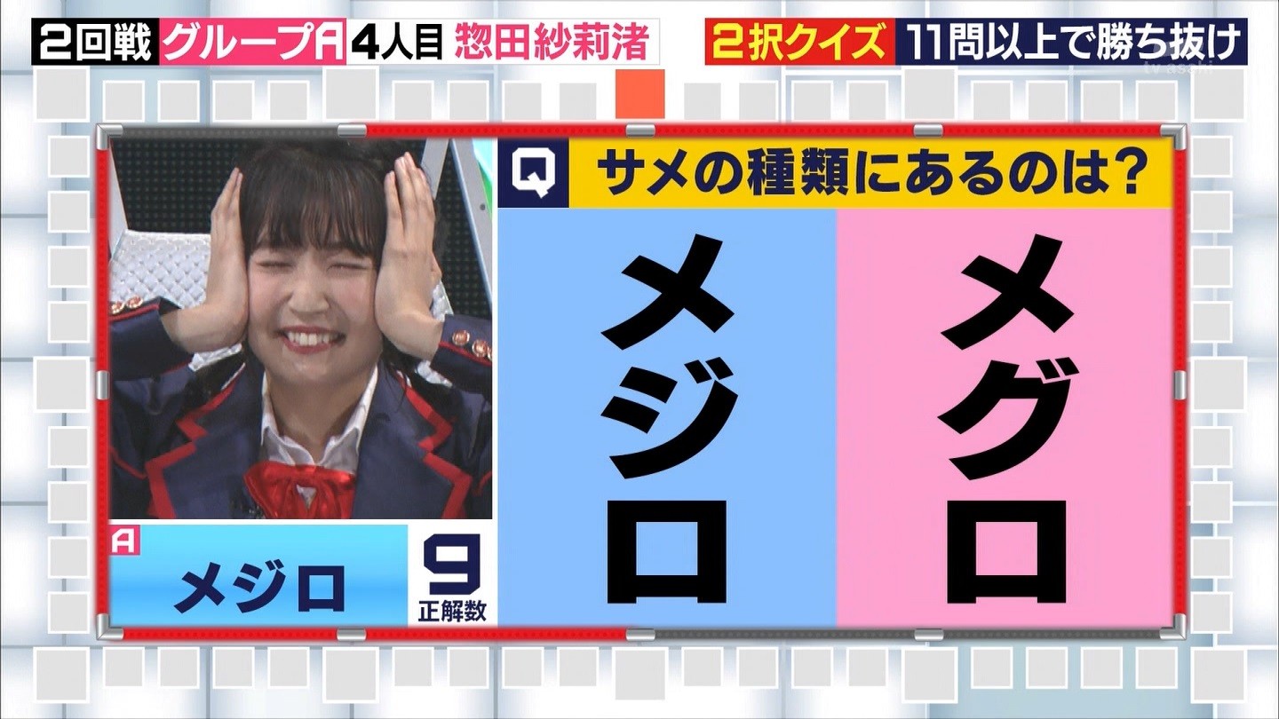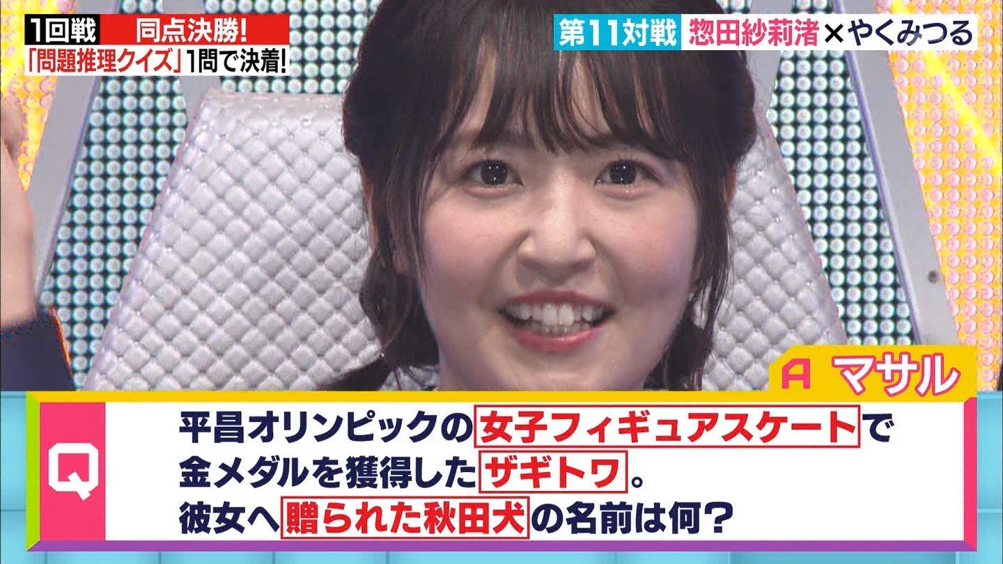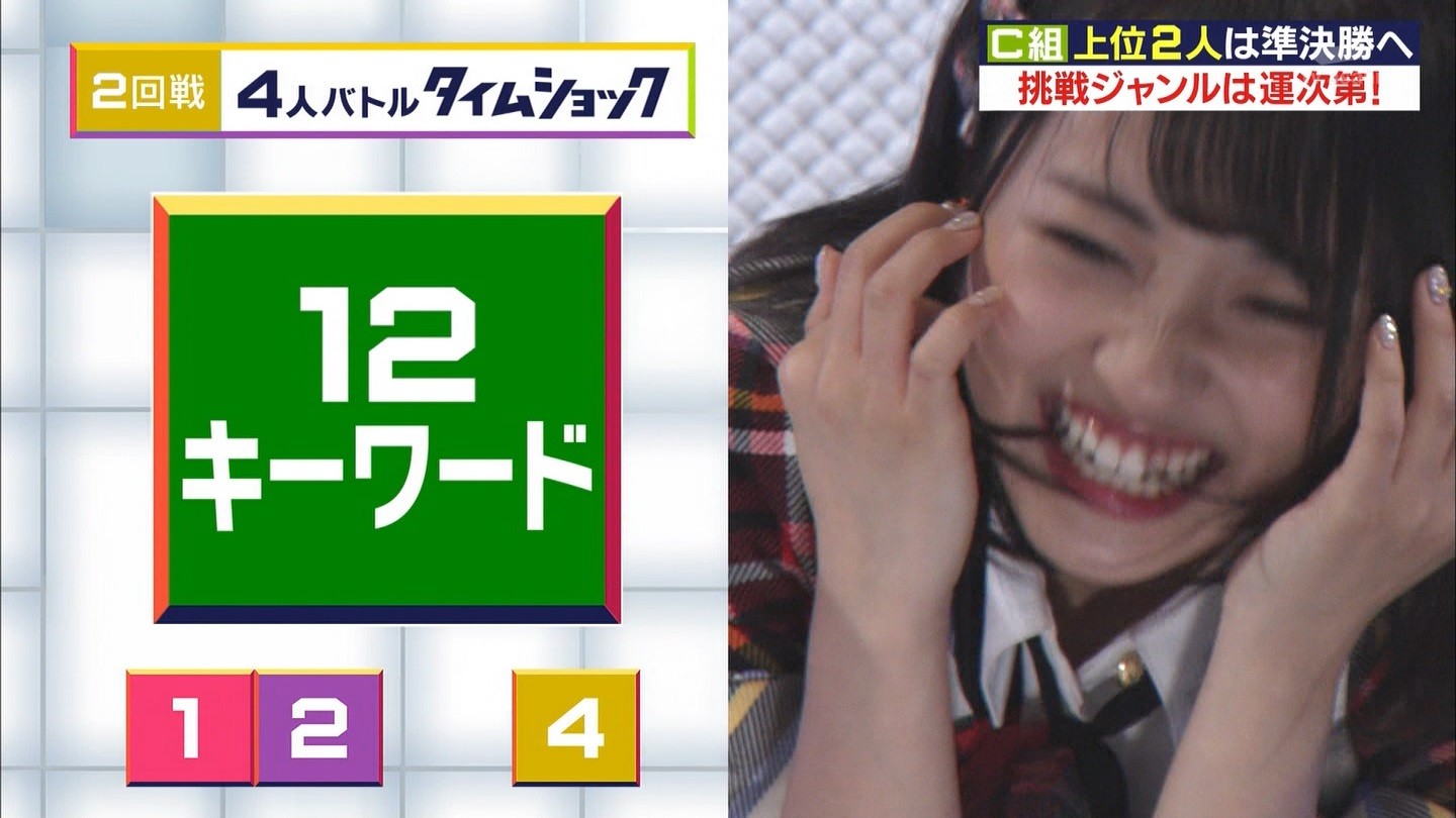- ※14 勝っただけでなく、勝ち方が良かった。最後の問題で追いついて、推理問題でやくさんとほぼ同時に答えての、タッチの差での勝利。オーディション合格の時から変わらない、ギリギリセーフのチキンレースが持ち味。この子は持ってるわ。これからもクイズレジェンド達をバッタバッタとやっつけてって欲しい。ただ、一つ注文をつけるとすれば、「なんとしても勝たなきゃ!」の気持ちは分かるけど、そこは抑えて、その場の雰囲気も楽しめるくらいに、遊び心が持てるようになれれば満点です♪