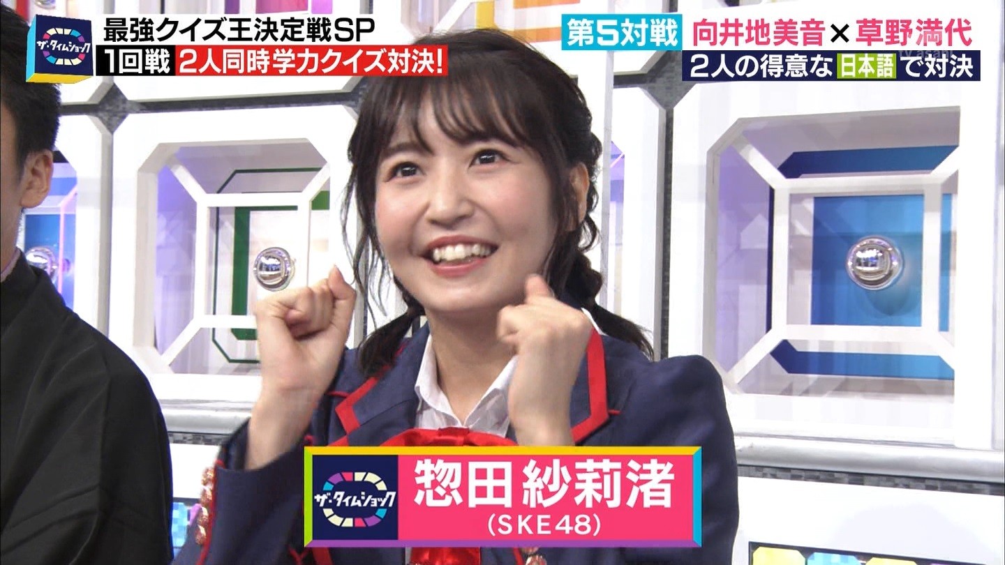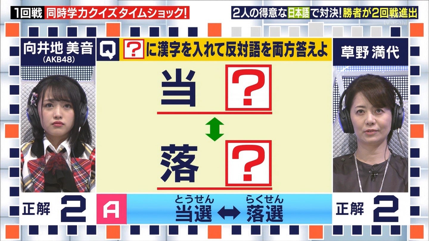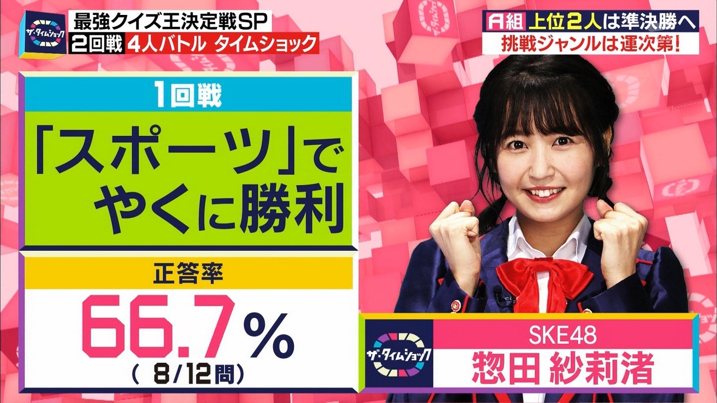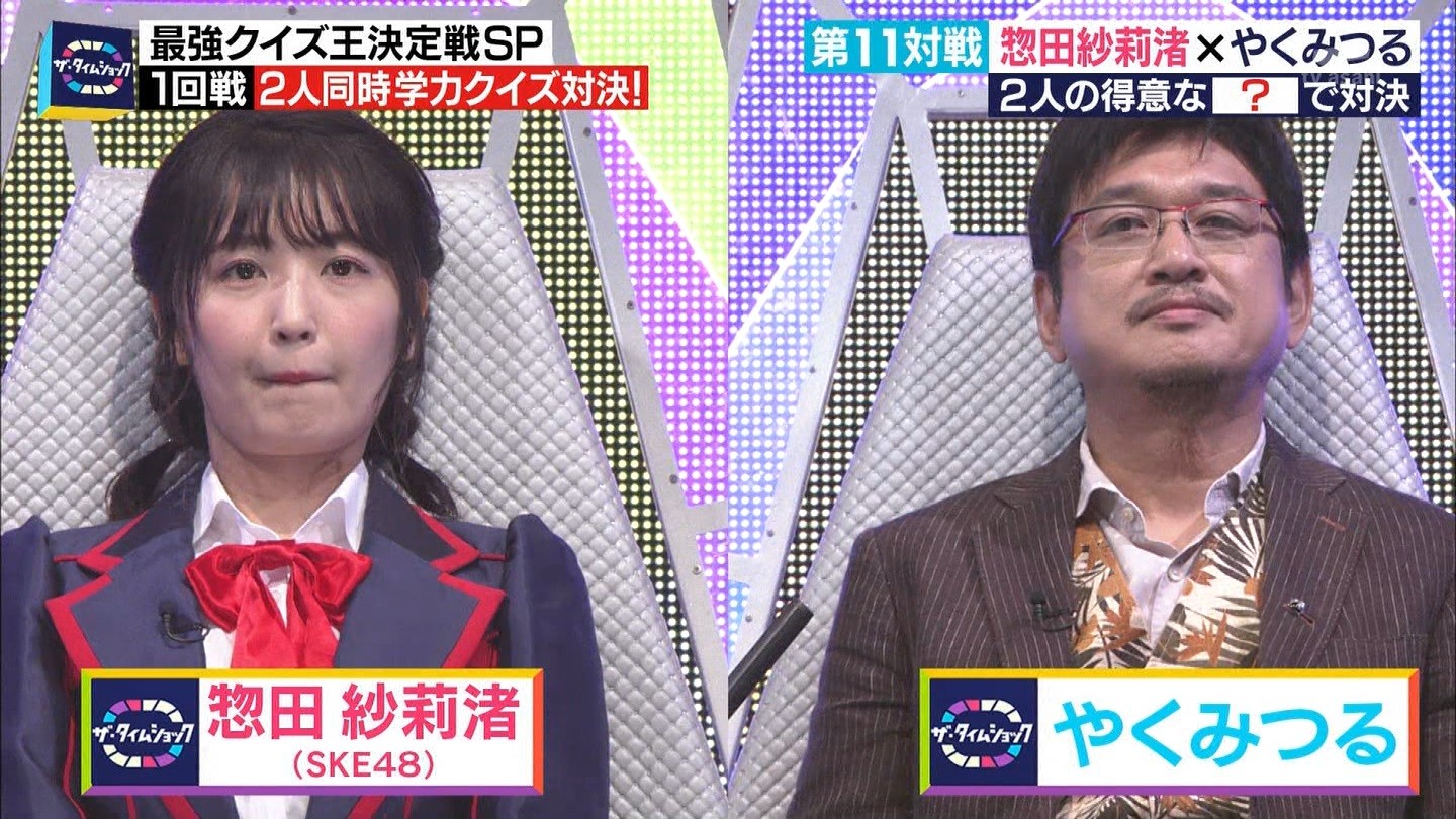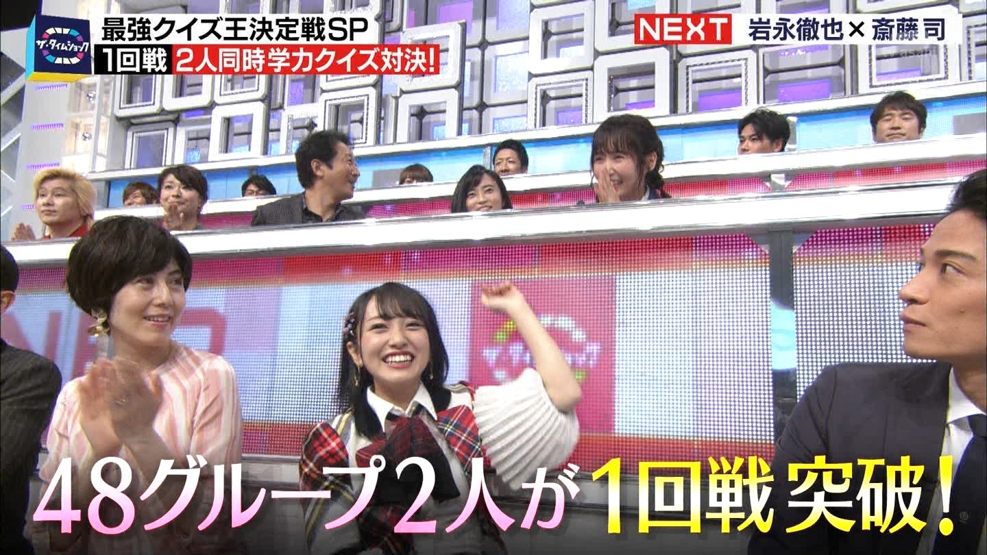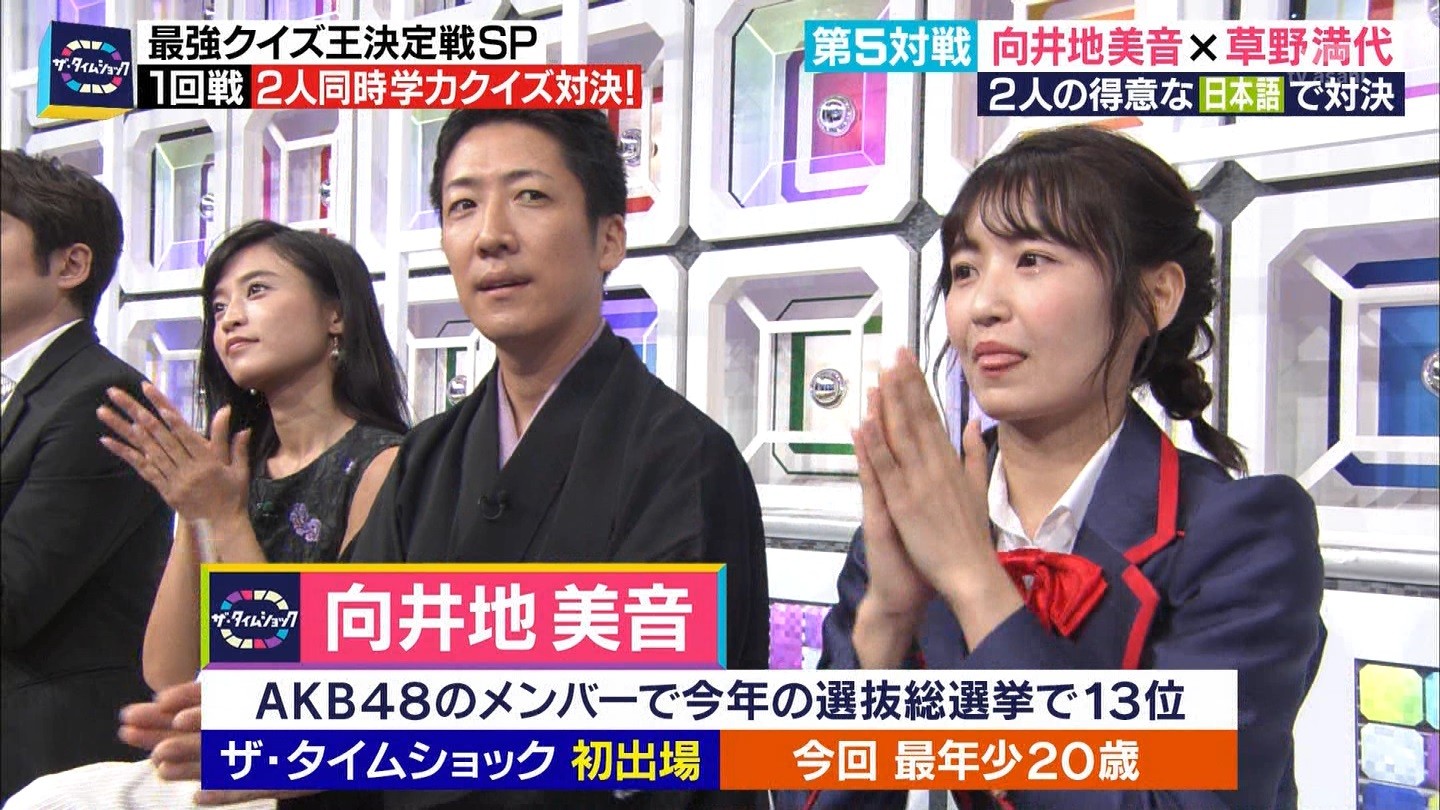 - ※14 勝っただけでなく、勝ち方が良かった。最後の問題で追いついて、推理問題でやくさんとほぼ同時に答えての、タッチの差での勝利。オーディション合格の時から変わらない、ギリギリセーフのチキンレースが持ち味。この子は持ってるわ。これからもクイズレジェンド達をバッタバッタとやっつけてって欲しい。ただ、一つ注文をつけるとすれば、「なんとしても勝たなきゃ!」の気持ちは分かるけど、そこは抑えて、その場の雰囲気も楽しめるくらいに、遊び心が持てるようになれれば満点です♪