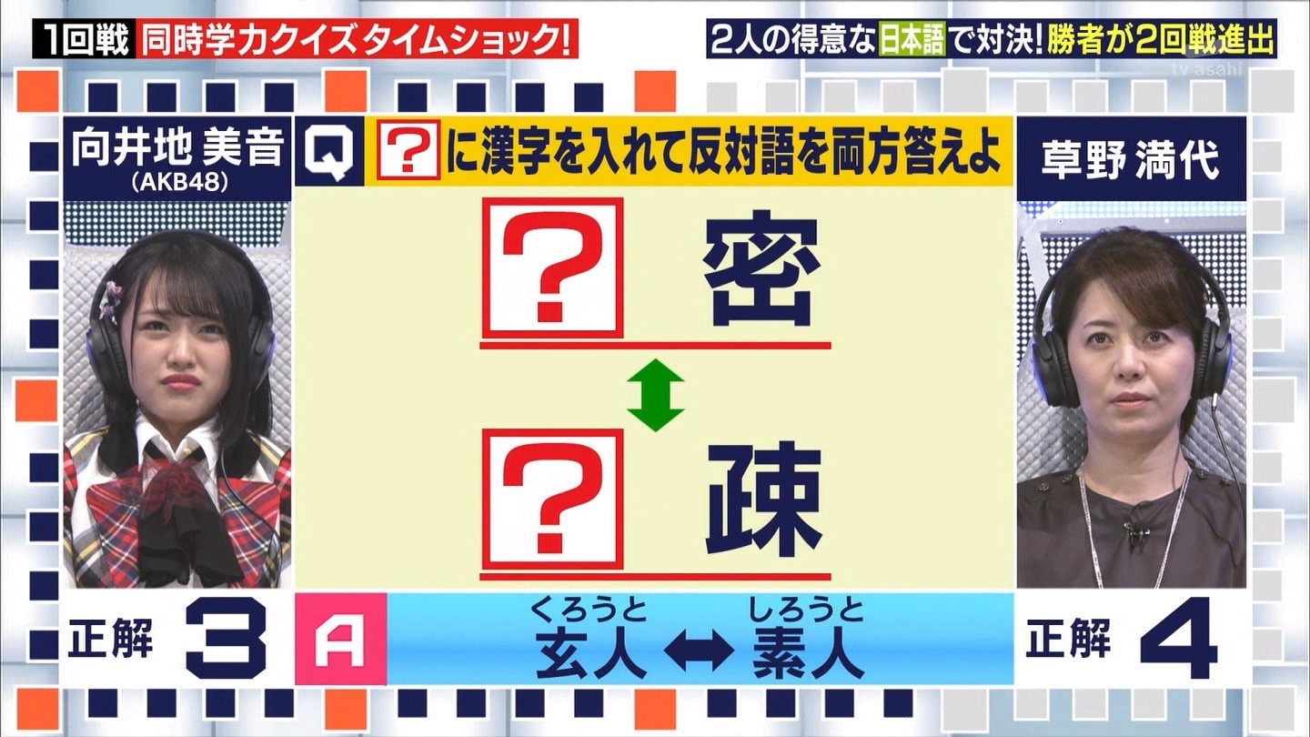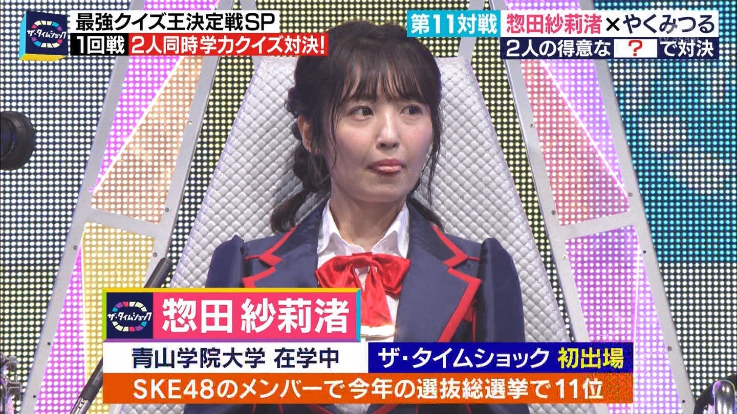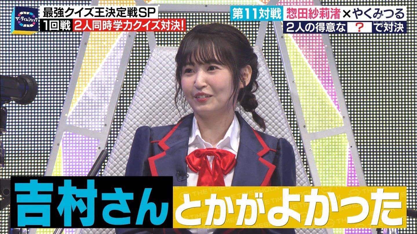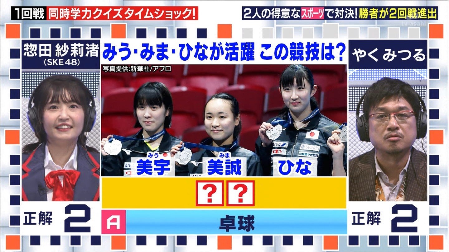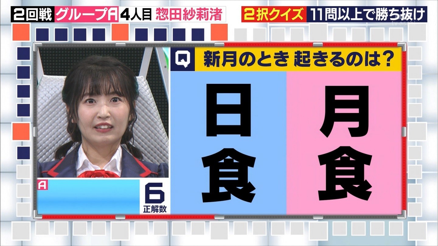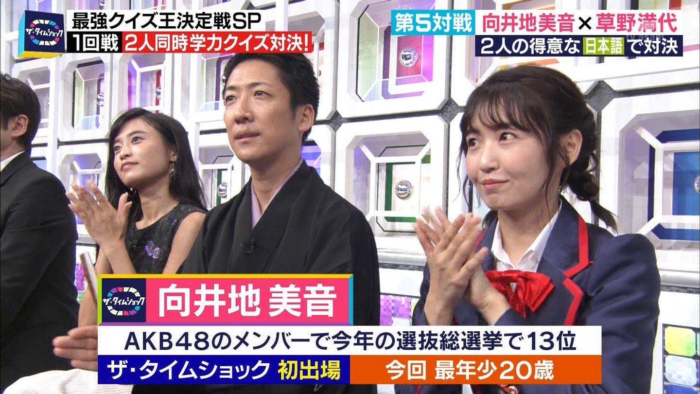 - ※14 勝っただけでなく、勝ち方が良かった。最後の問題で追いついて、推理問題でやくさんとほぼ同時に答えての、タッチの差での勝利。オーディション合格の時から変わらない、ギリギリセーフのチキンレースが持ち味。この子は持ってるわ。これからもクイズレジェンド達をバッタバッタとやっつけてって欲しい。ただ、一つ注文をつけるとすれば、「なんとしても勝たなきゃ!」の気持ちは分かるけど、そこは抑えて、その場の雰囲気も楽しめるくらいに、遊び心が持てるようになれれば満点です♪