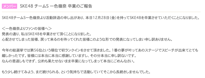 SKE48チームS一色嶺奈より活動辞退の申し出があり、本日12月28日(金)を持ってSKE48を卒業させていただくことになりました。