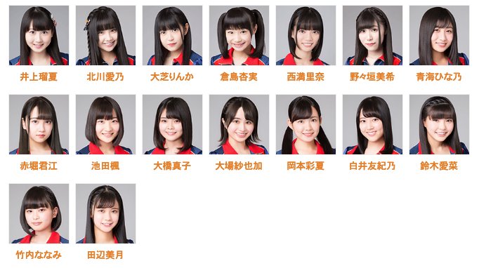井上瑠夏・北川愛乃・大芝りんか・倉島杏実・西満里奈・野々垣美希・青海ひな乃・赤堀君江・池田楓・大橋真子・大場紗也加・岡本彩夏・白井友紀乃・鈴木愛菜・竹内ななみ・田辺美月
