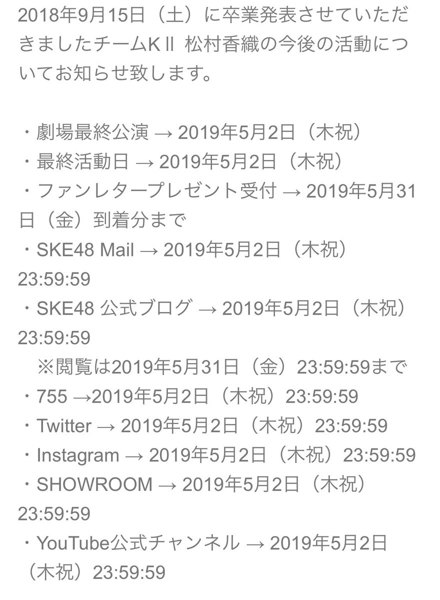 — 松村香織【SKE48】 (@kaotan_0117) 2019年4月30日