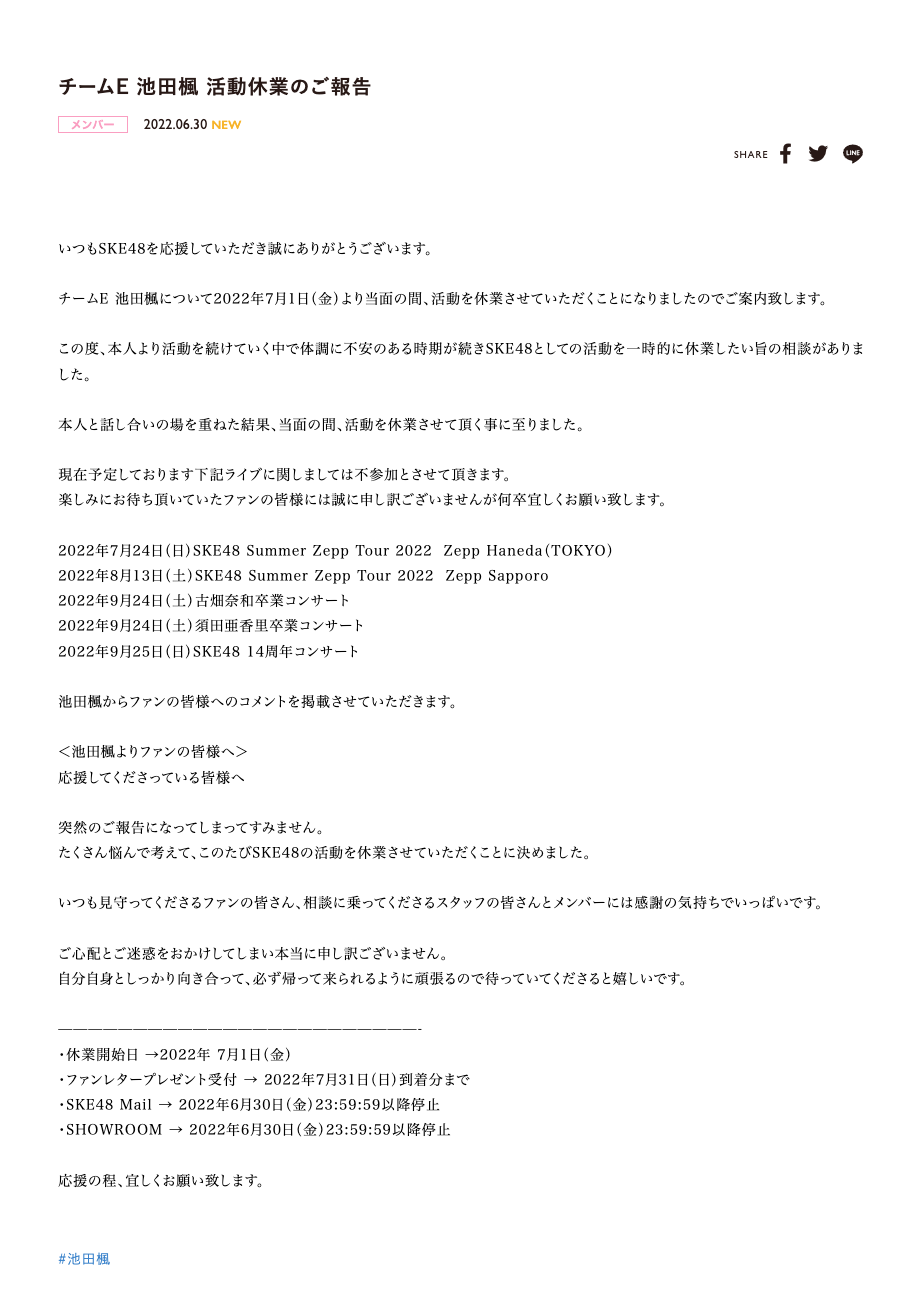 この度、本人より活動を続けていく中で体調に不安のある時期が続きSKE48としての活動を一時的に休業したい旨の相談がありました。