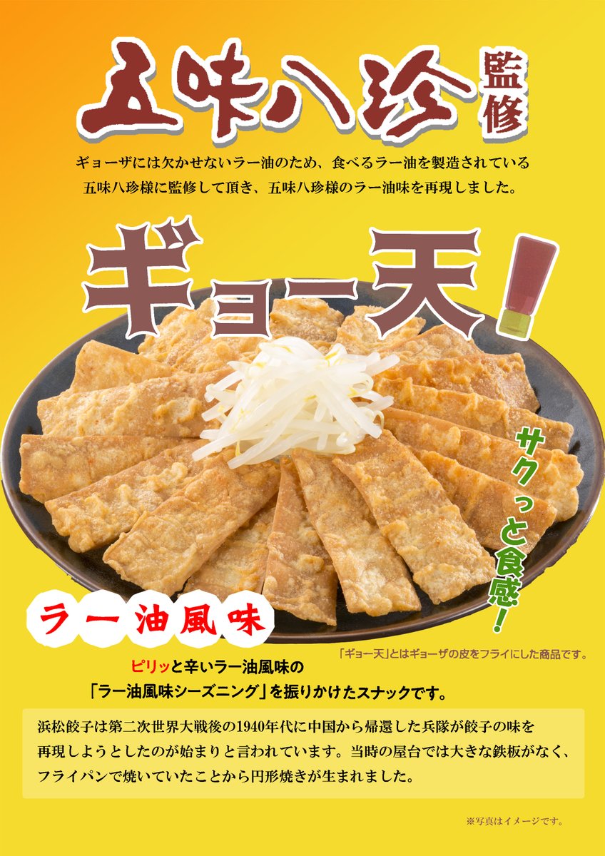 ギョー天は #浜松餃子 の香ばしい旨味と最後にくるラー油のピリ辛を見事に表現したスナック菓子✨