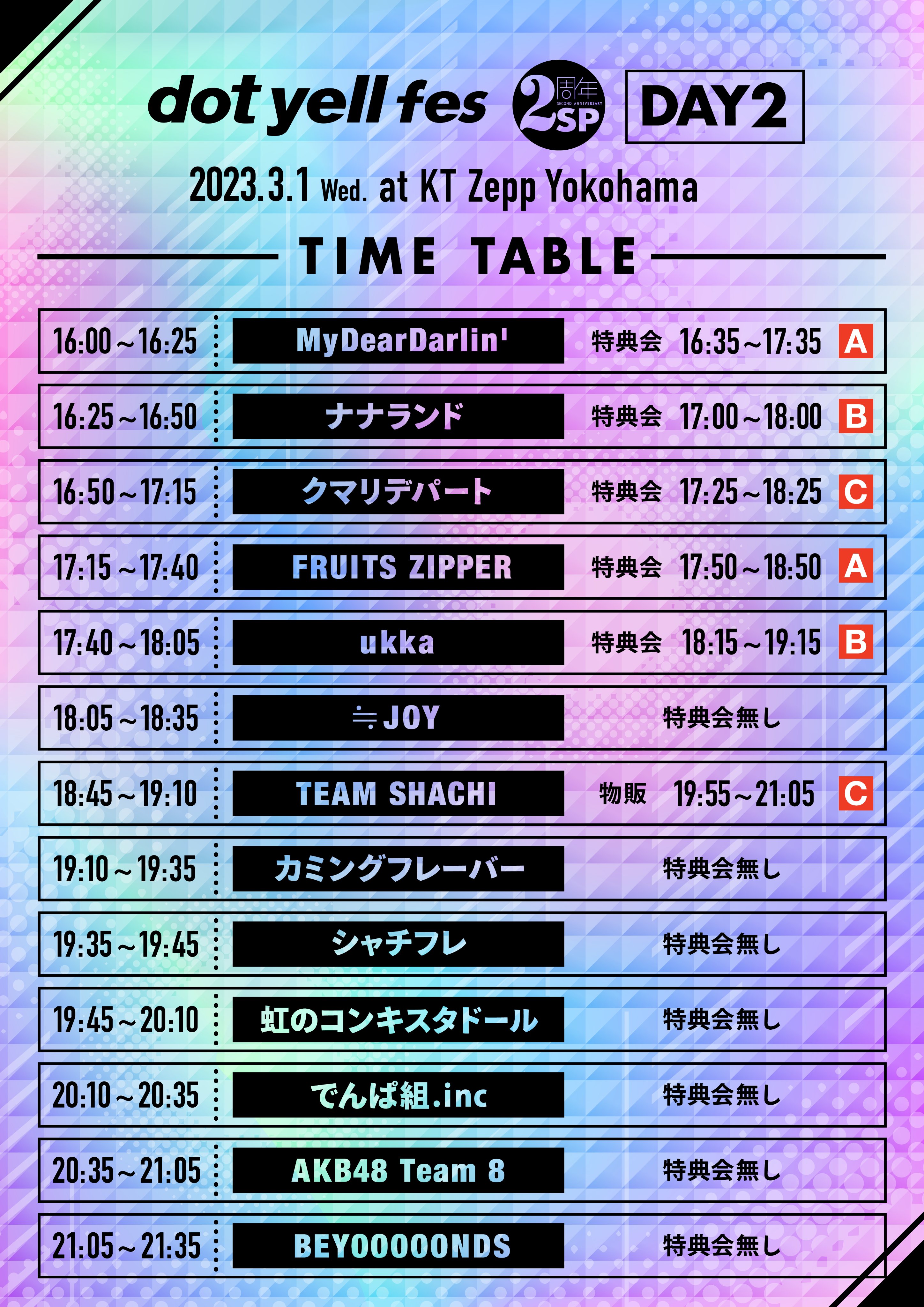 【出演】BEYOOOOONDS/ AKB48 Team 8 / ≒JOY / カミングフレーバー/ TEAM SHACHI / シャチフレ / ukka / でんぱ組.inc / 虹のコンキスタドール / MyDearDarlin’ / クマリデパート / FRUITS ZIPPER / ナナランド