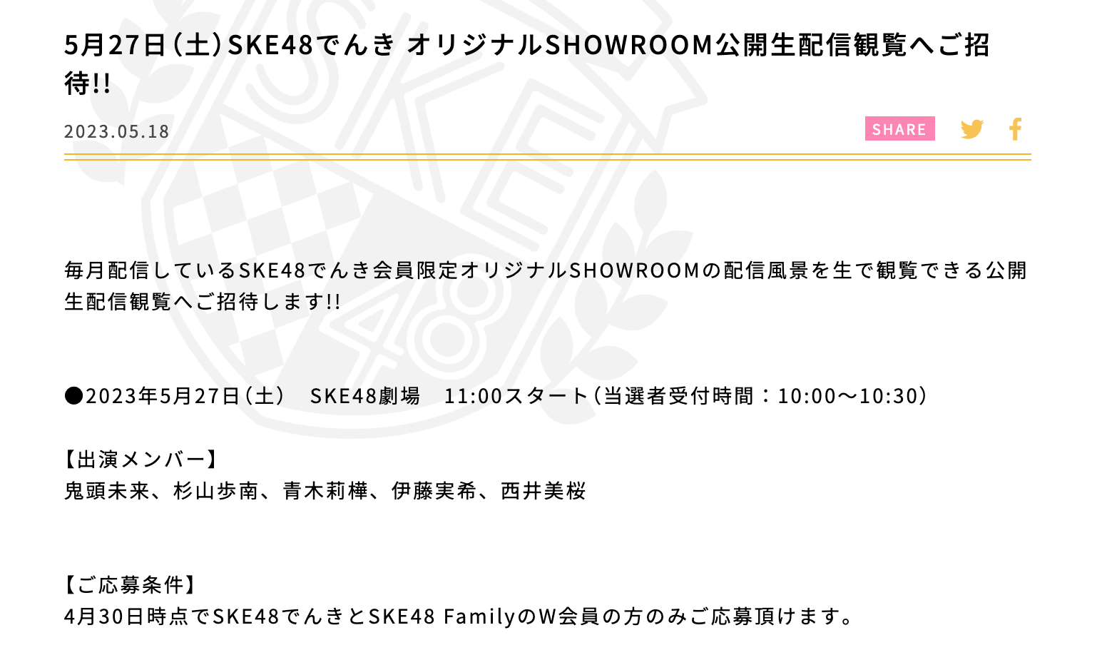 5月27日(土)SKE48でんき オリジナルSHOWROOM公開生配信観覧へご招待!!