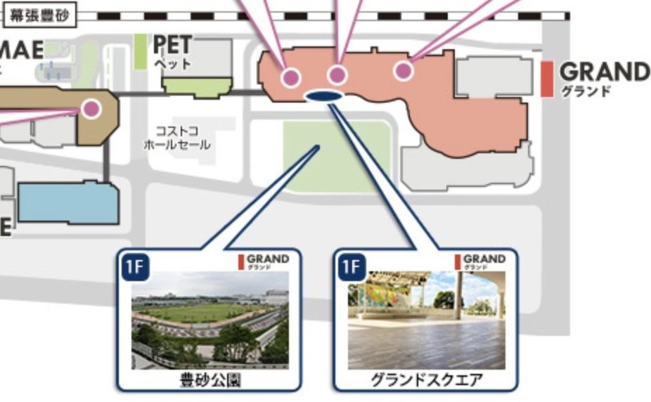 イオンモール幕張新都心の最寄り駅は、海浜豊砂駅(幕張メッセの最寄り駅・海浜幕張の隣)です。