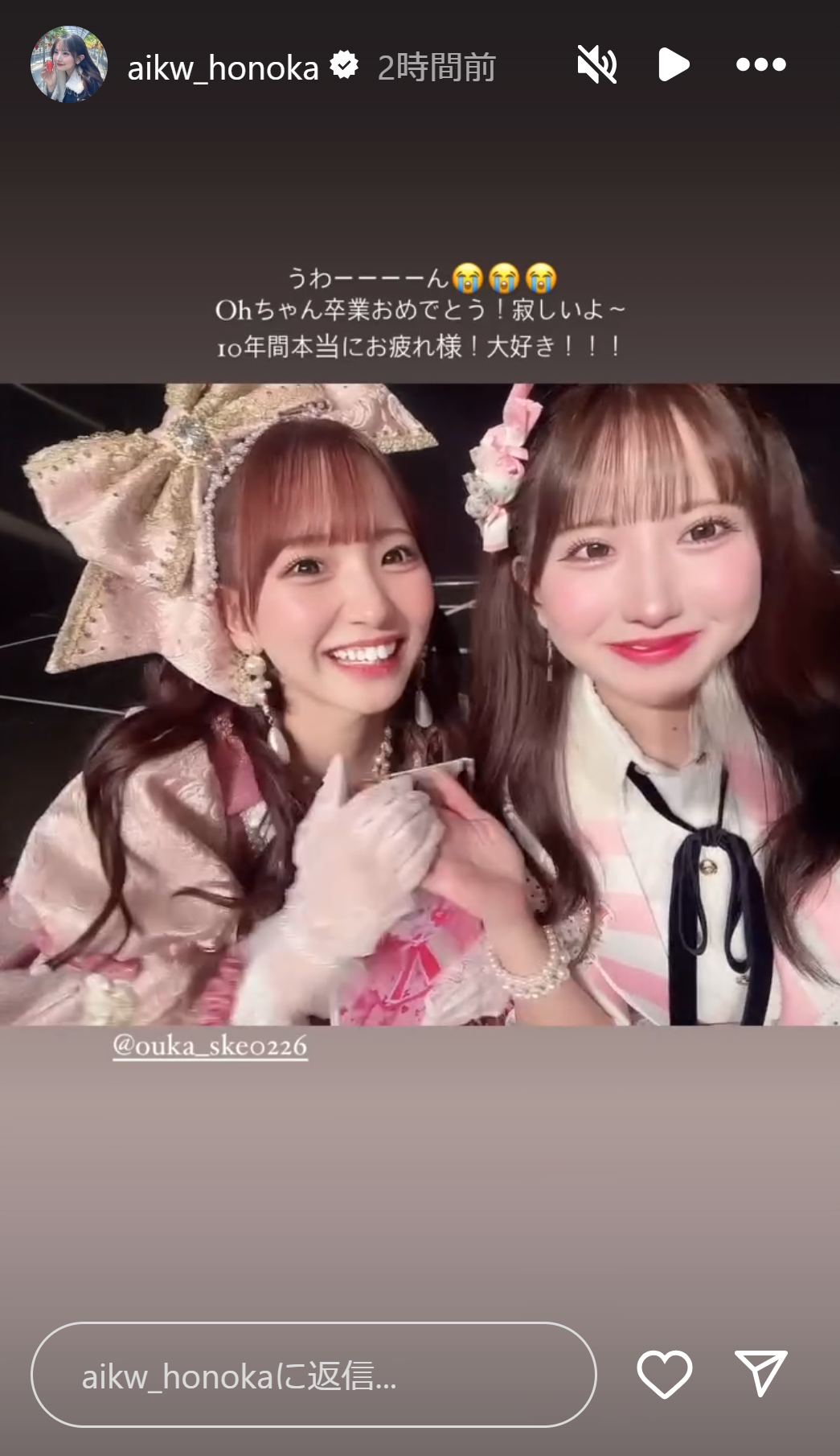卒業おめでとう!青春を共に駆け抜けた戦友でもあり、大切な仲間!ついにこの日が来ちゃったかーって感じだったけど、おーちゃんと最後のステージに一緒に立つことができて幸せでした!いつも幸せをくれた分、沢山幸せになってね。10年間本当にお疲れ様でした🌸ずっと大好きだよ! #末永桜花卒業公演 pic.twitter.com/ATfLEYDi9Y