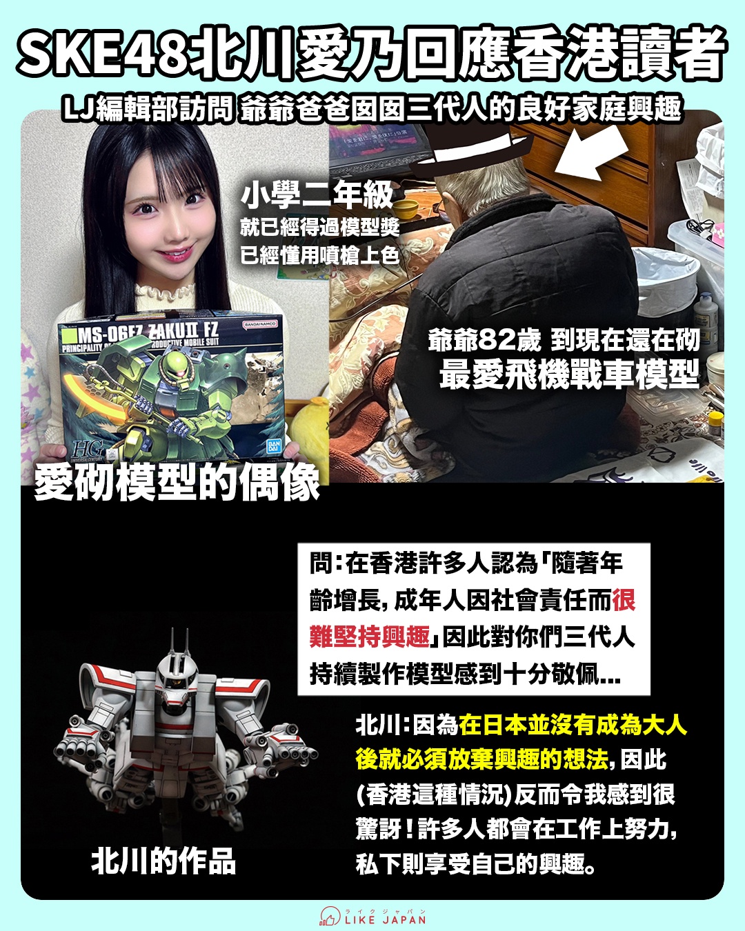 稍前我們報道SKE48成員北川愛乃,她自己與爸爸及爺爺三代人是模型世家,都是模型愛好者。他們在長大後依然繼續鍾愛自己的興趣,爺爺更是82歲也繼續在砌。這個報道得到讀者大量讚美,欣賞這家人傳承良好的興趣,一代傳一代做自己愛的事。
