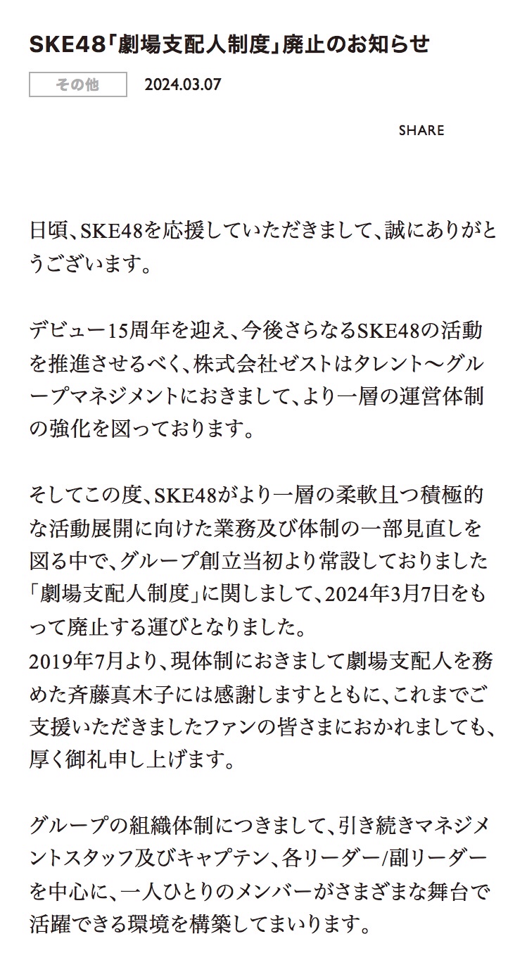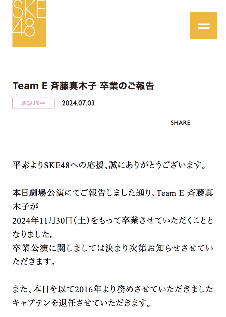 📣松本慈子 SKE48キャプテン就任のお知らせ