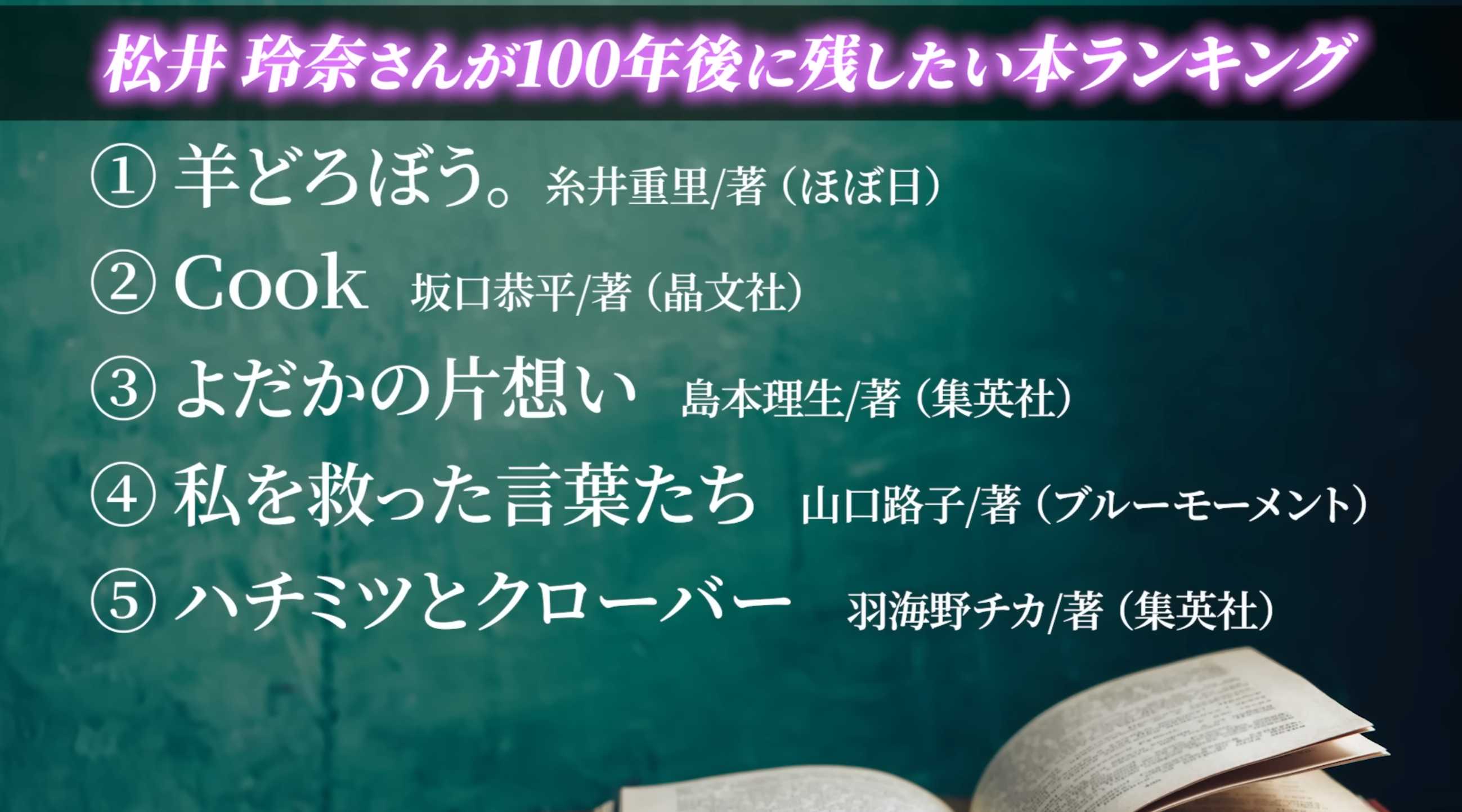 引用元「心のお守りにしたくなる」松井玲奈が100年後に残したい本とは...? - YouTube